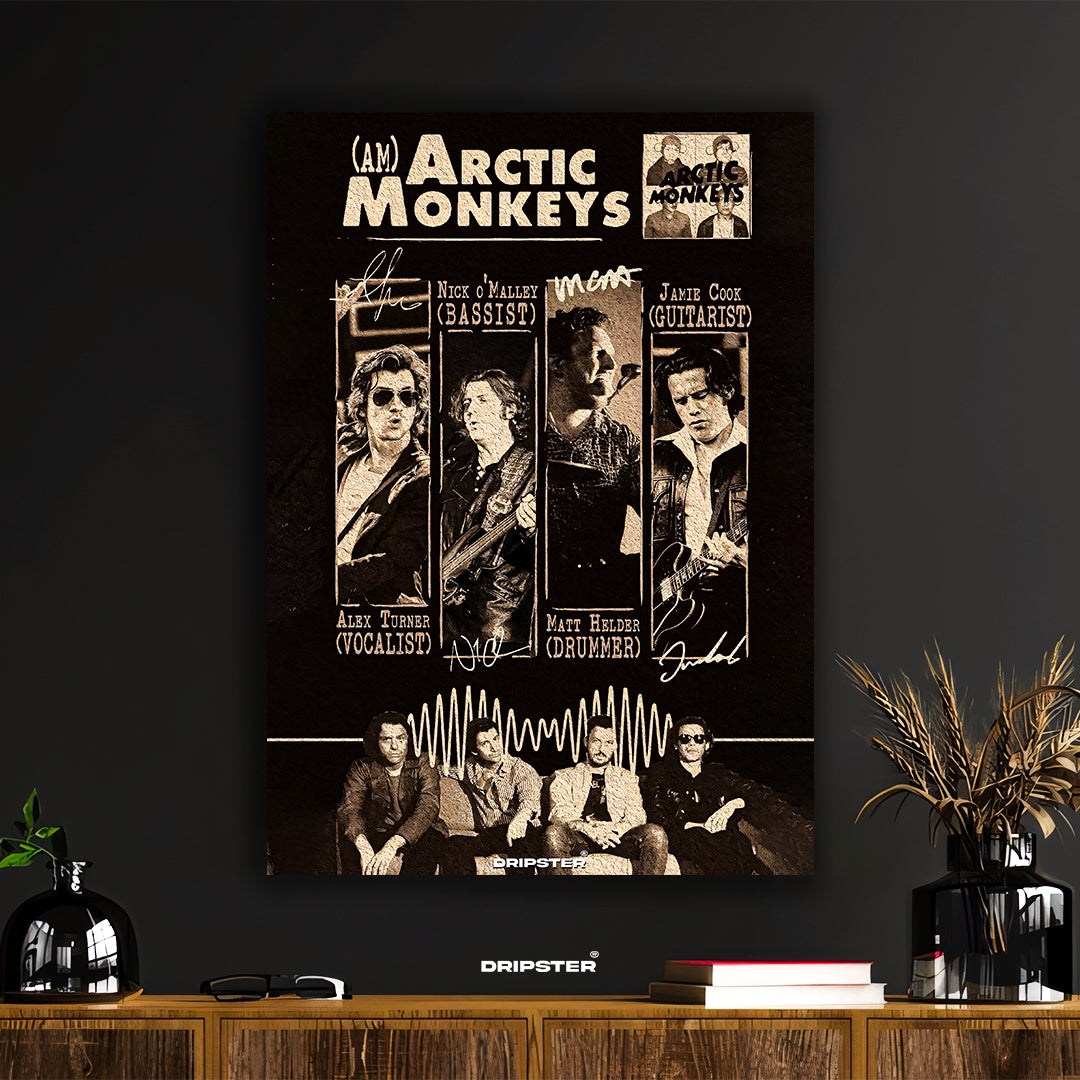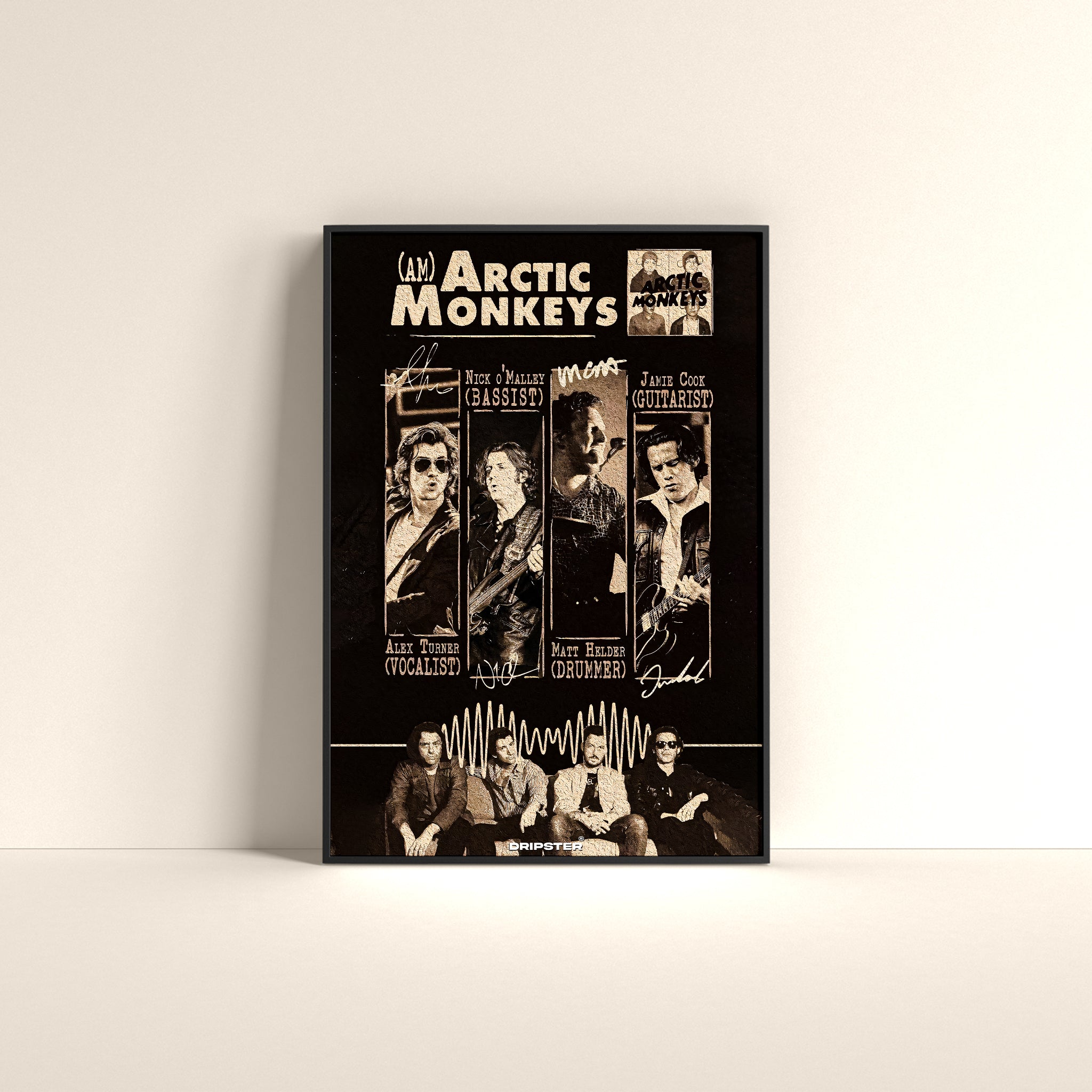 Immerse yourself in the iconic world of Arctic Monkeys with this stunning vintage-style poster, featuring the full band lineup from their seminal "AM" era. Each member—Alex Turner, Nick O'Malley, Matt Helder, and Jamie Cook—is captured in a classic, sepia-toned portrait, set against a dark, textured background with a distinctive soundwave graphic. This print is a must-have for any true fan, celebrating the enduring legacy of one of the most influential bands of our time.