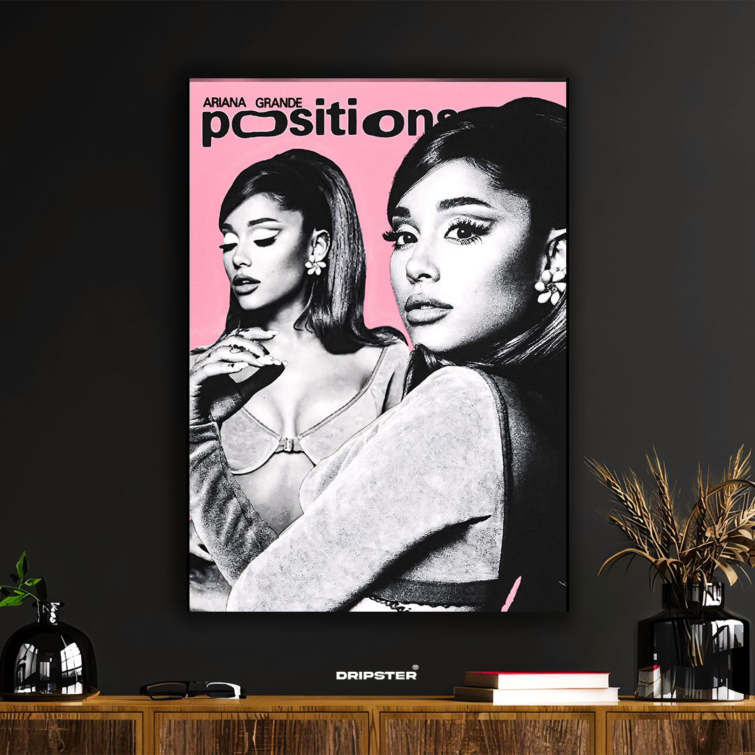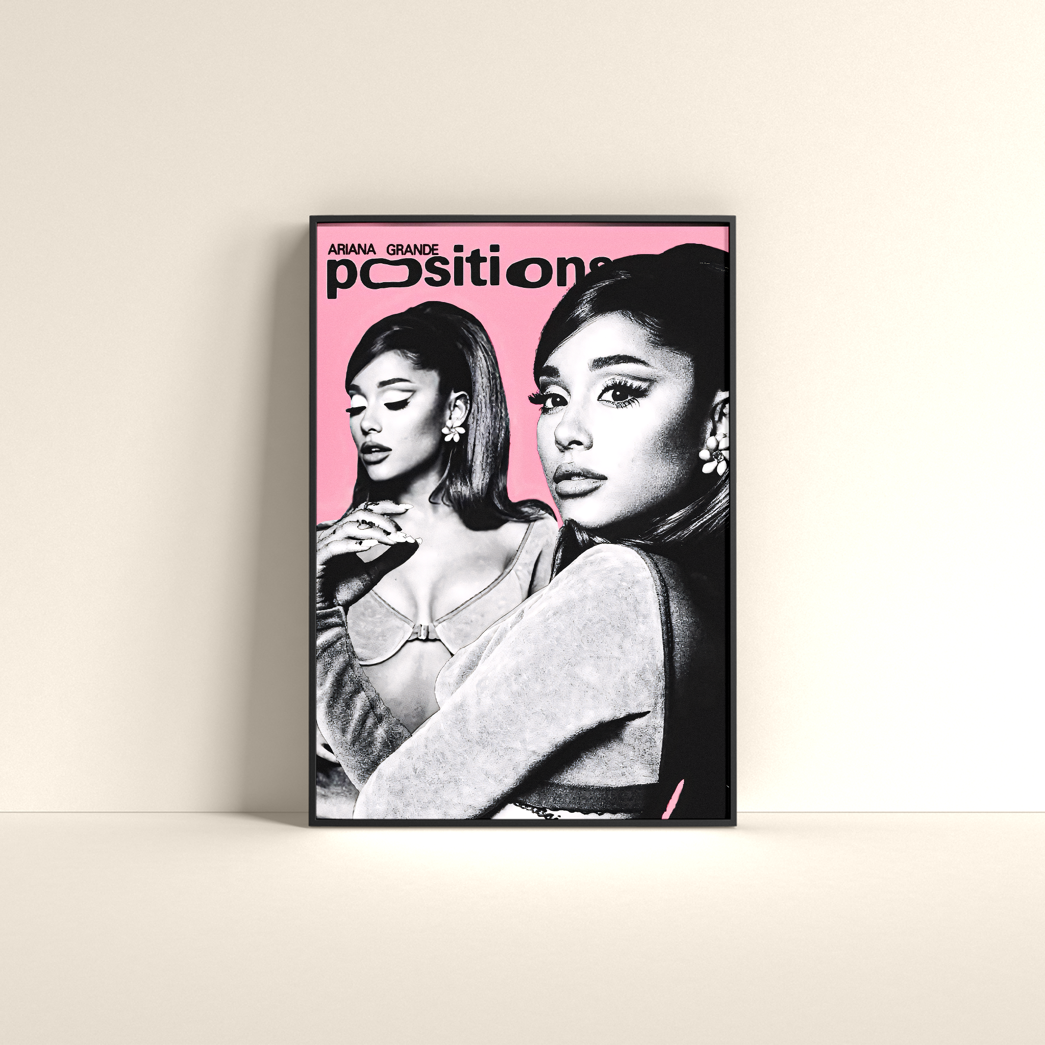 Celebrate the elegance and artistry of Ariana Grande with this stunning Positions era poster. Featuring a chic pink and grayscale palette, this design captures Ariana in two striking portraits — blending vintage glamour with modern pop sophistication.