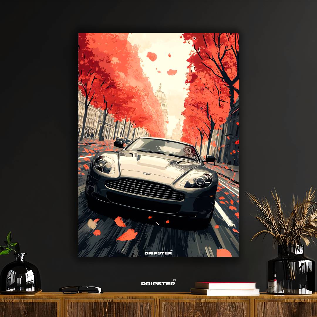Experience the thrill of a classic drive with this captivating poster featuring an Aston Martin V12 Vantage cruising down an autumnal street. The artwork beautifully captures the car's sleek lines against a backdrop of vibrant red foliage, with fallen leaves scattered across the road. This piece exudes a sense of speed and elegance, perfectly blending the beauty of nature with the power of British automotive engineering. It's an ideal choice for luxury car enthusiasts and those who appreciate sophisticated design and a hint of seasonal charm.
