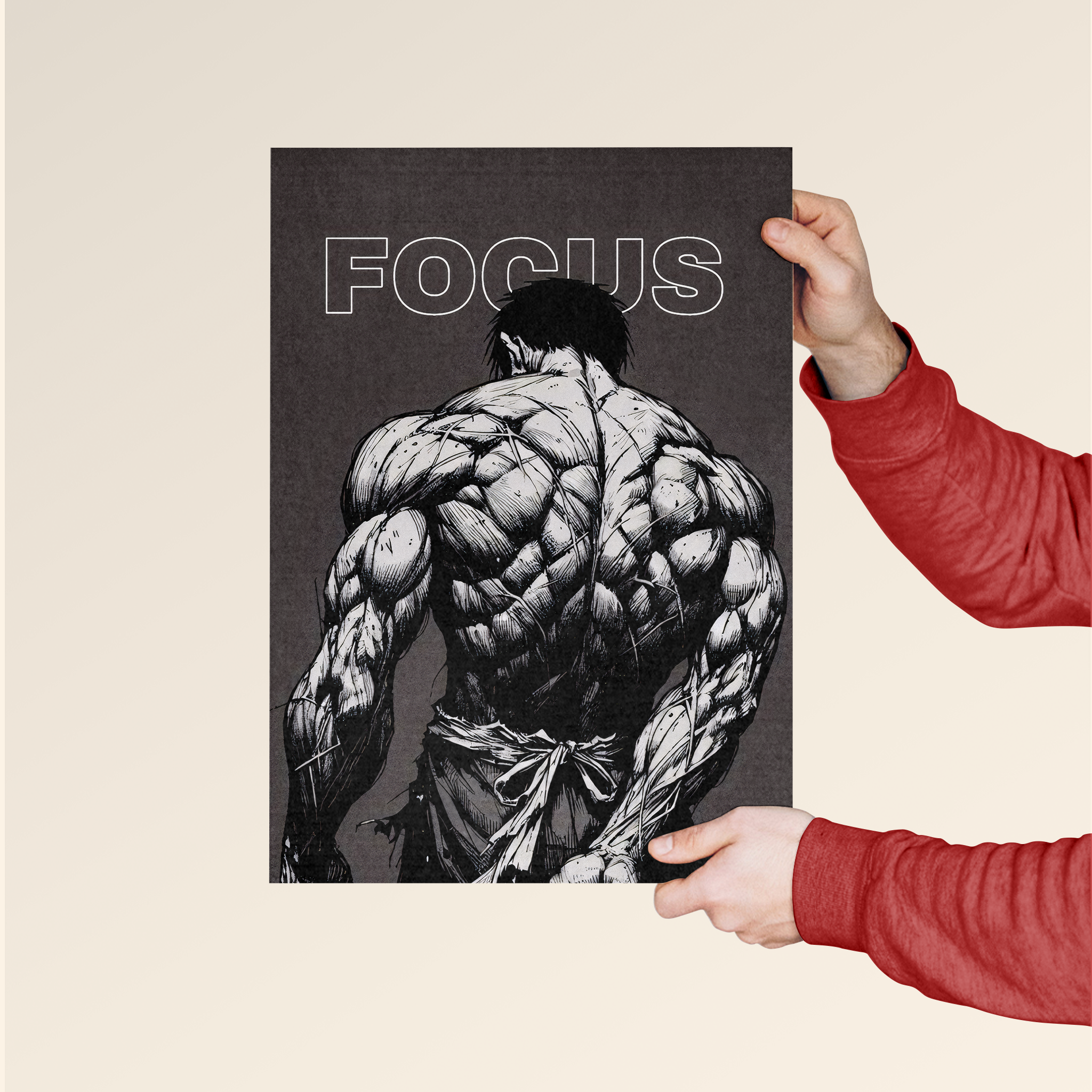Channel the raw power of Baki with this intense poster featuring a muscular back view of the fighter, showcasing his incredible strength and determination. The bold "FOCUS" text against a dark background adds a motivational edge. Perfect for anime fans and fitness enthusiasts.