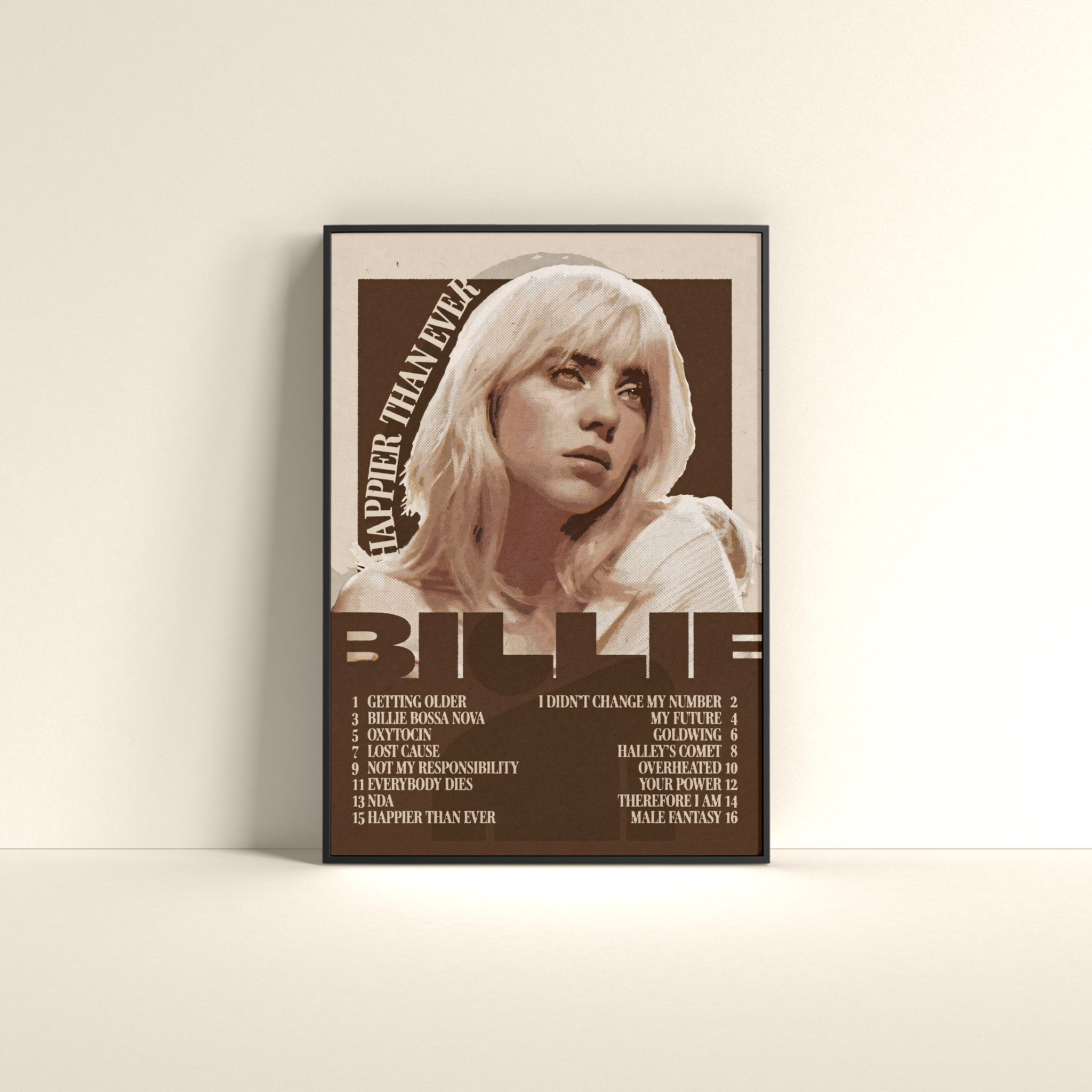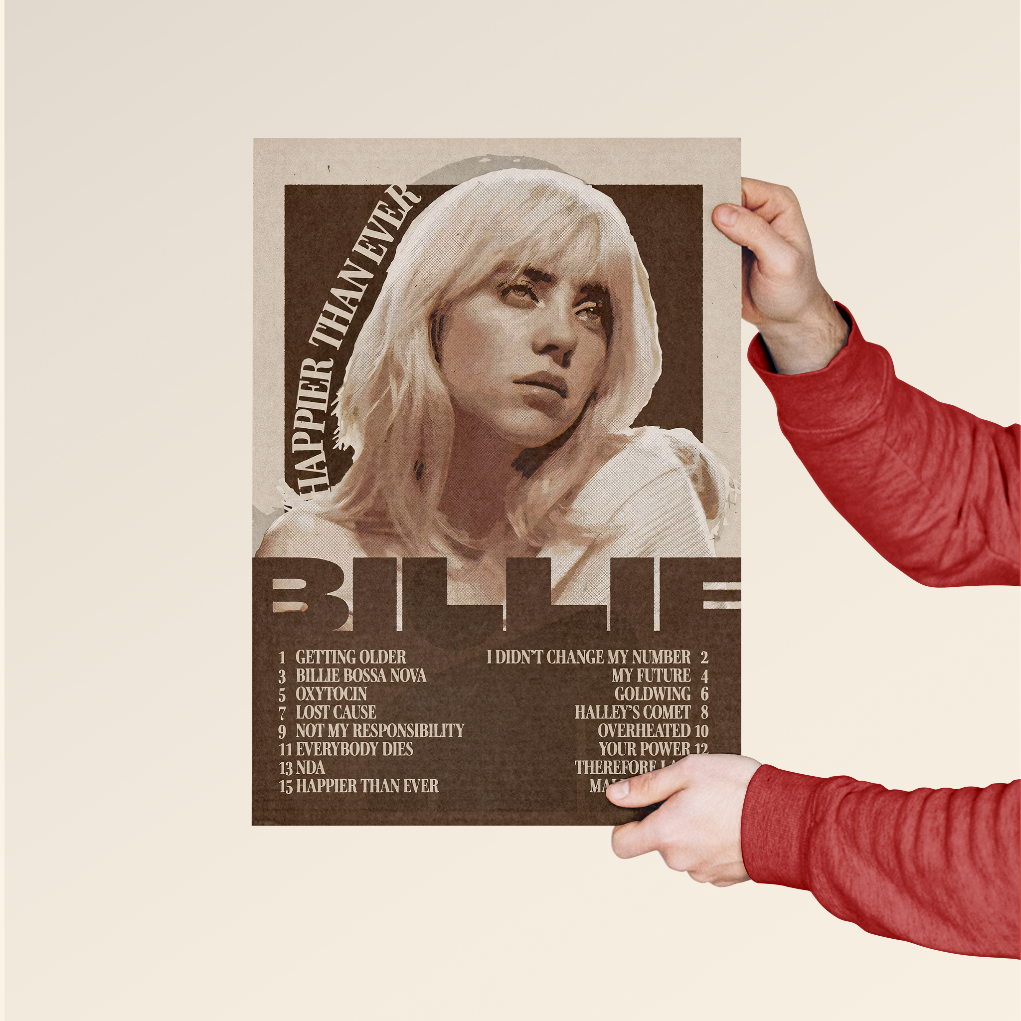 Celebrate the introspective artistry of Billie Eilish with this vintage-inspired Happier Than Ever poster. Featuring a sepia-toned portrait of Billie and a full tracklist from the critically acclaimed album, this piece blends emotional resonance with nostalgic design.