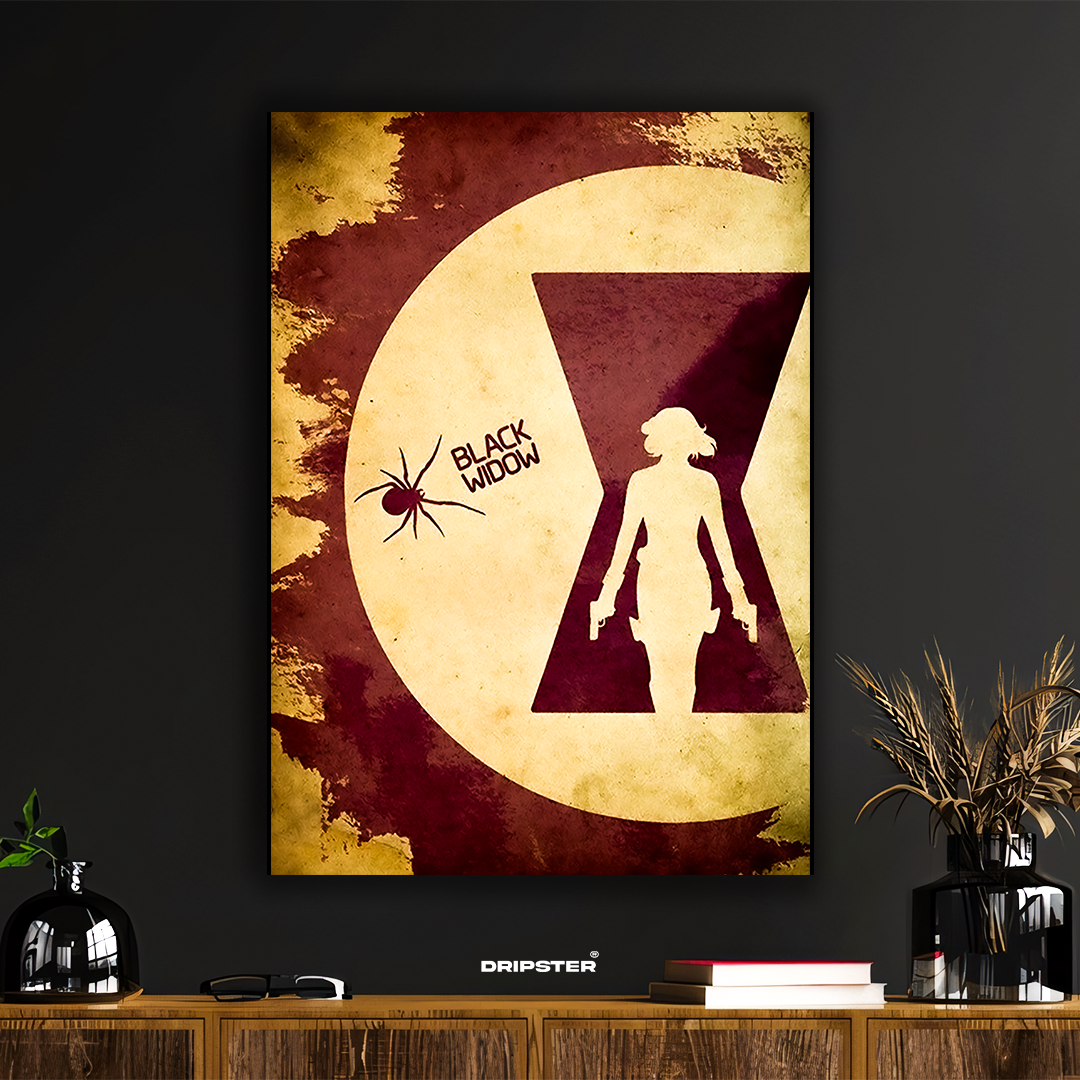 Celebrate the legacy of Natasha Romanoff with this bold Black Widow poster, featuring her iconic silhouette set against a stylized hourglass symbol. With grunge textures and vintage tones of crimson and gold, this piece captures the elegance and lethal precision of Marvel’s most enigmatic Avenger.