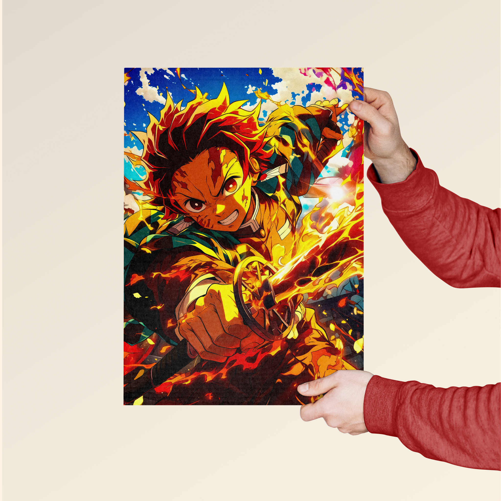 Ignite your passion for Demon Slayer with this electrifying poster featuring Tanjiro Kamado wielding his fiery blade. The vibrant orange and blue background, filled with dynamic flames and energy, captures his fierce determination. Perfect for anime fans and lovers of the Demon Slayer series.