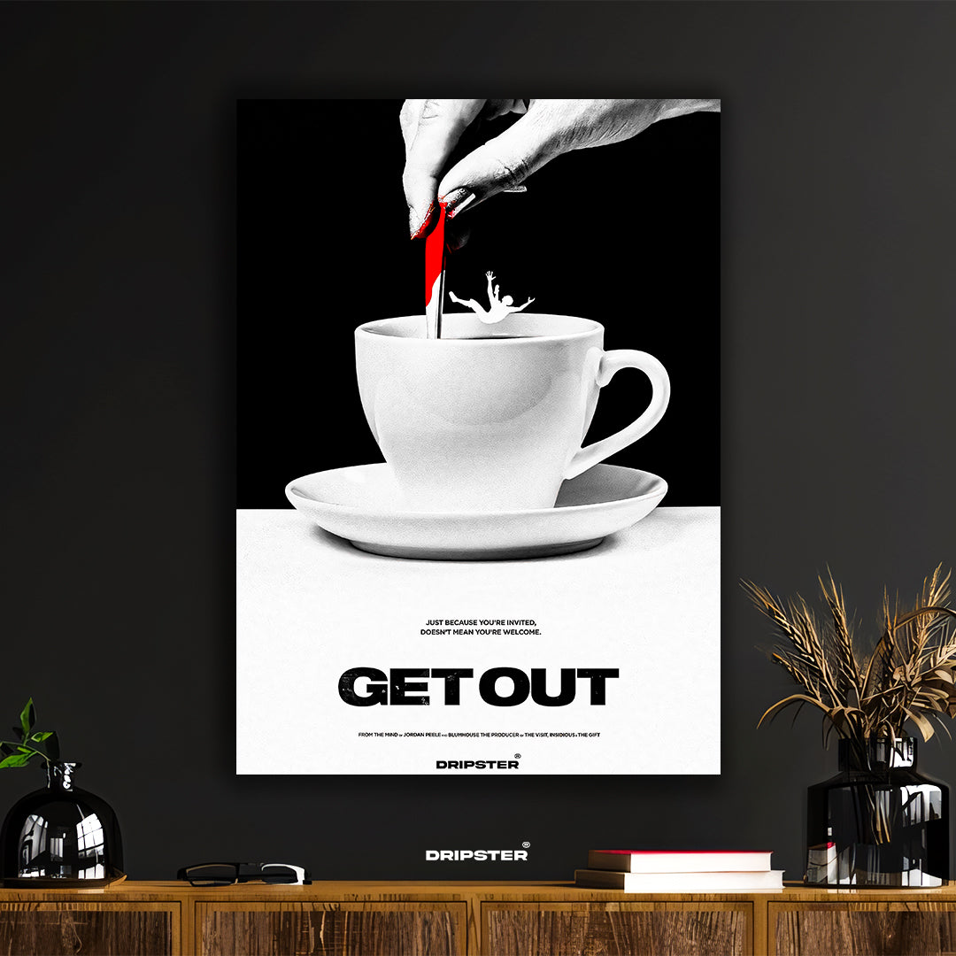 Immerse yourself in the chilling world of Jordan Peele's masterpiece with this striking 'Get Out' movie poster. Featuring the iconic imagery of a figure falling into a teacup, subtly manipulated by a hand, this print perfectly captures the psychological tension and unsettling themes of the acclaimed film. The minimalist design, with its stark black, white, and red accent, makes a powerful and thought-provoking statement.