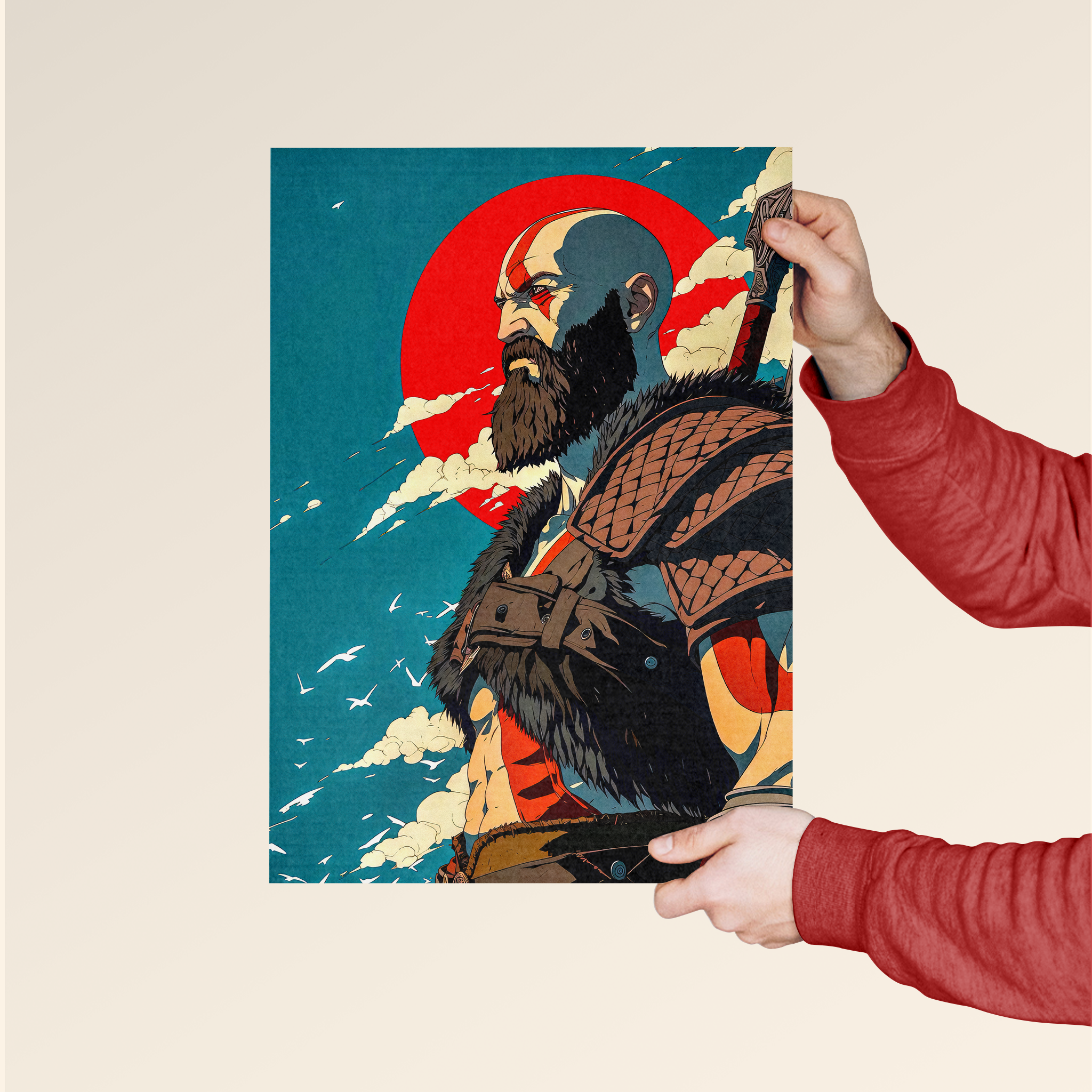 Embrace the fierce legacy of Kratos with this striking God of War poster. The warrior stands tall against a dramatic blue and red backdrop with a rising sun, symbolizing his unyielding strength. Perfect for gaming fans and lovers of epic mythology-inspired art.