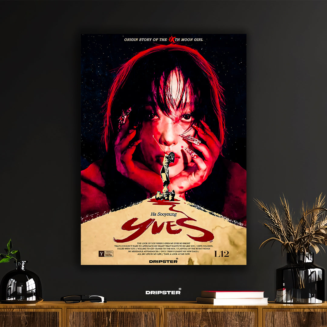 This unique poster is an essential addition for K-Pop enthusiasts, especially fans of Loona's Yves, or anyone drawn to dramatic, grunge-inspired, and artistic decor. It's perfect for adding a touch of edgy sophistication to bedrooms, creative studios, or entertainment areas, celebrating both music and contemporary art.