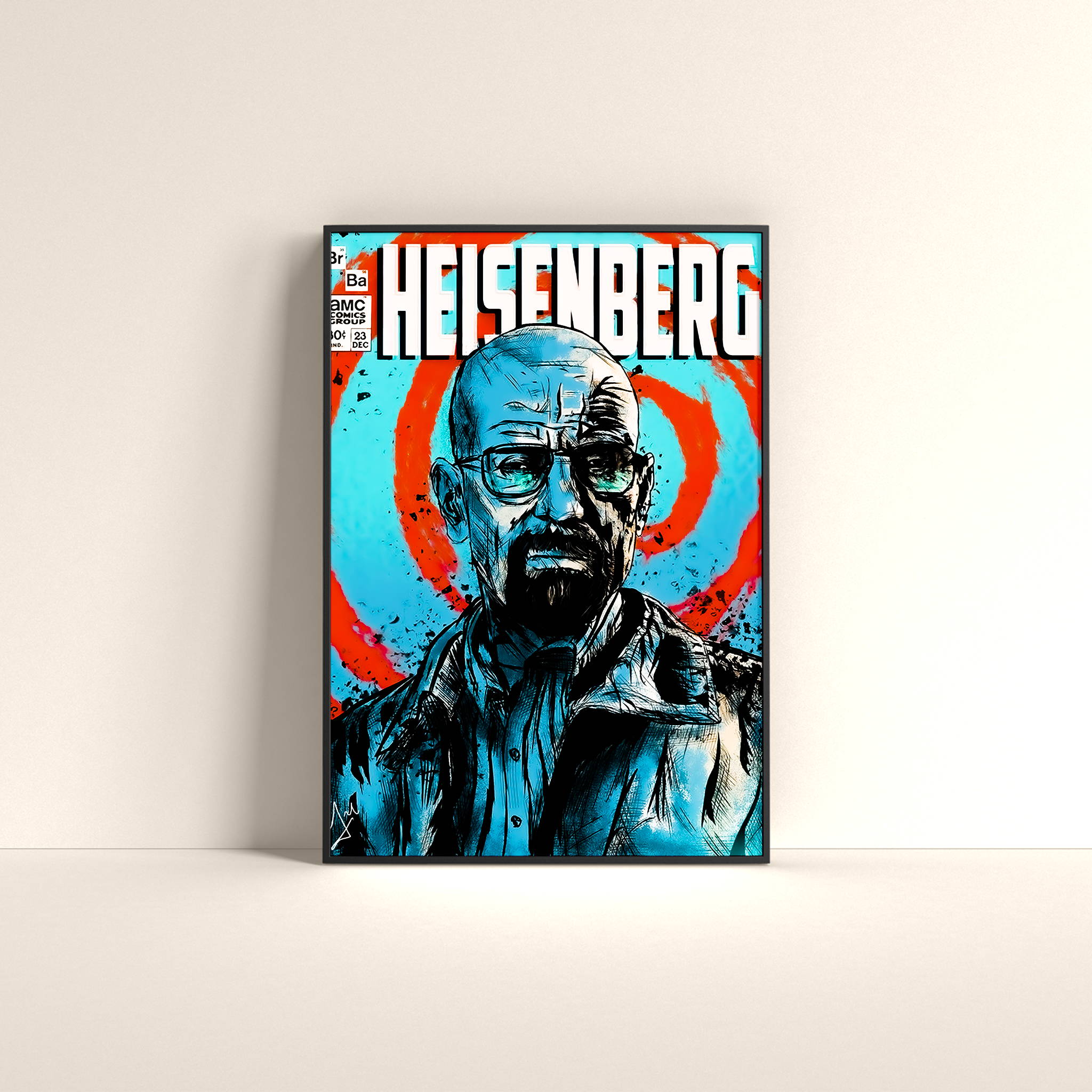 Channel the chilling transformation of Walter White with this intense Heisenberg poster, inspired by the iconic Breaking Bad series. Featuring a bold, comic-style illustration with vivid blue and red contrast, this artwork captures the menacing presence of the chemistry teacher turned drug kingpin.