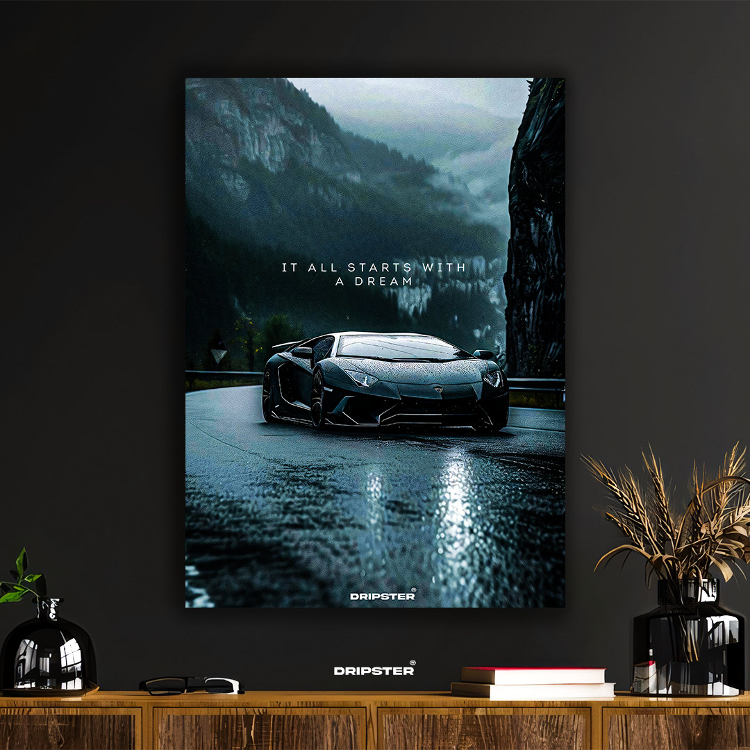 Ignite your aspirations with this breathtaking poster featuring the sleek Lamborghini Aventador, a true icon of automotive excellence. Captured against a dramatic, misty mountain backdrop, the dark, powerful supercar gleams on a wet road, embodying luxury and performance. The motivational text "IT ALL STARTS WITH A DREAM" reinforces the pursuit of greatness, making this piece perfect for anyone inspired by high-end vehicles and the journey to success.