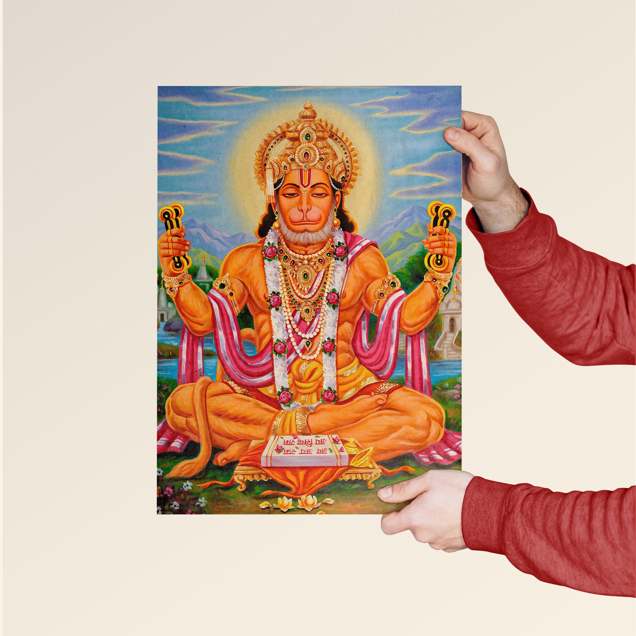 Invoke spiritual energy and divine protection with this vibrant poster of Lord Hanuman, the revered symbol of strength, devotion, and loyalty in Hindu tradition. Depicted in a meditative posture adorned with intricate jewelry and radiant colors, this artwork brings blessings, positivity, and calm into any space.