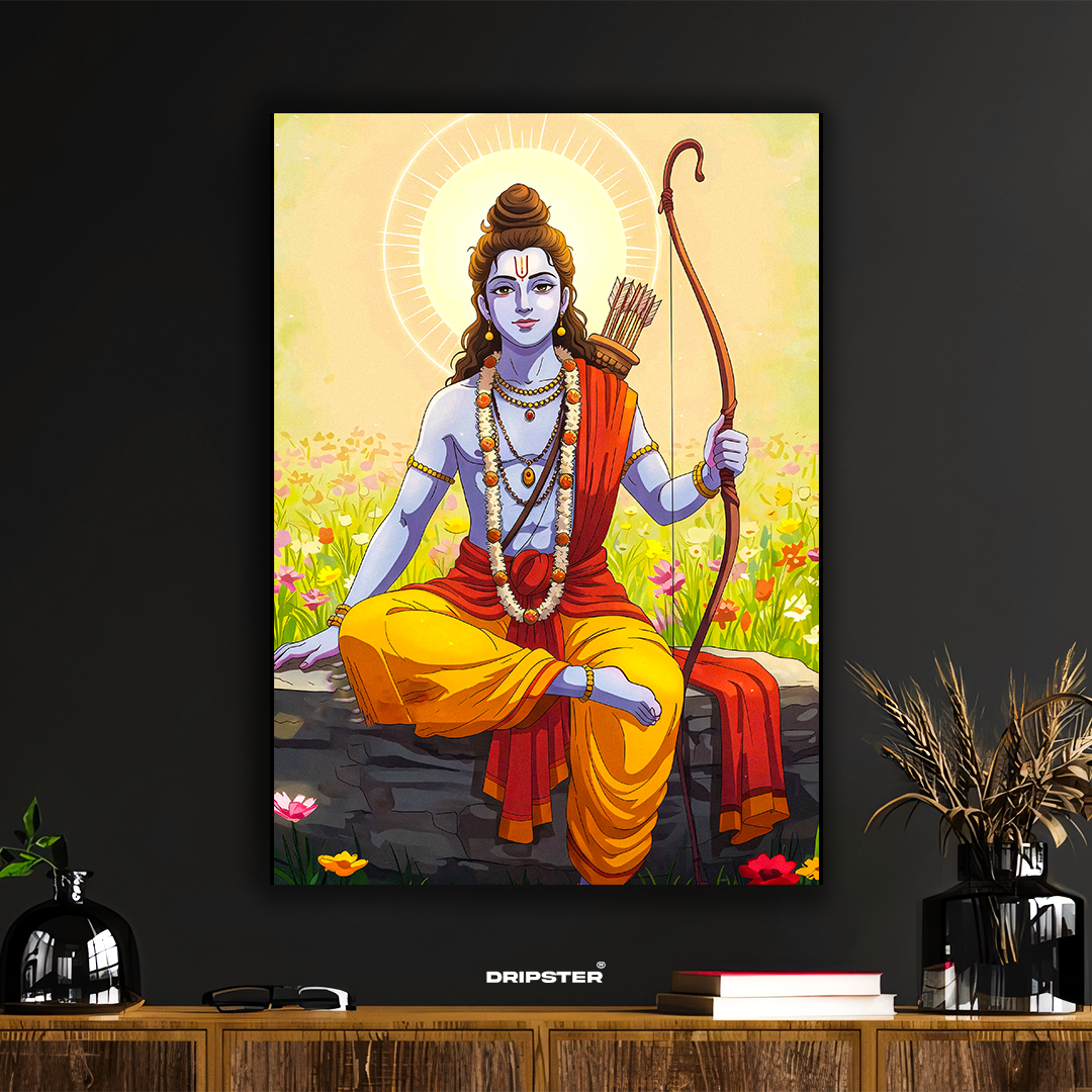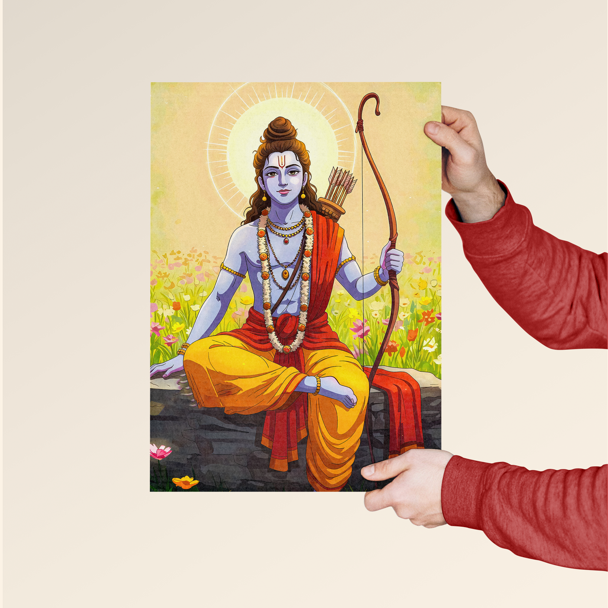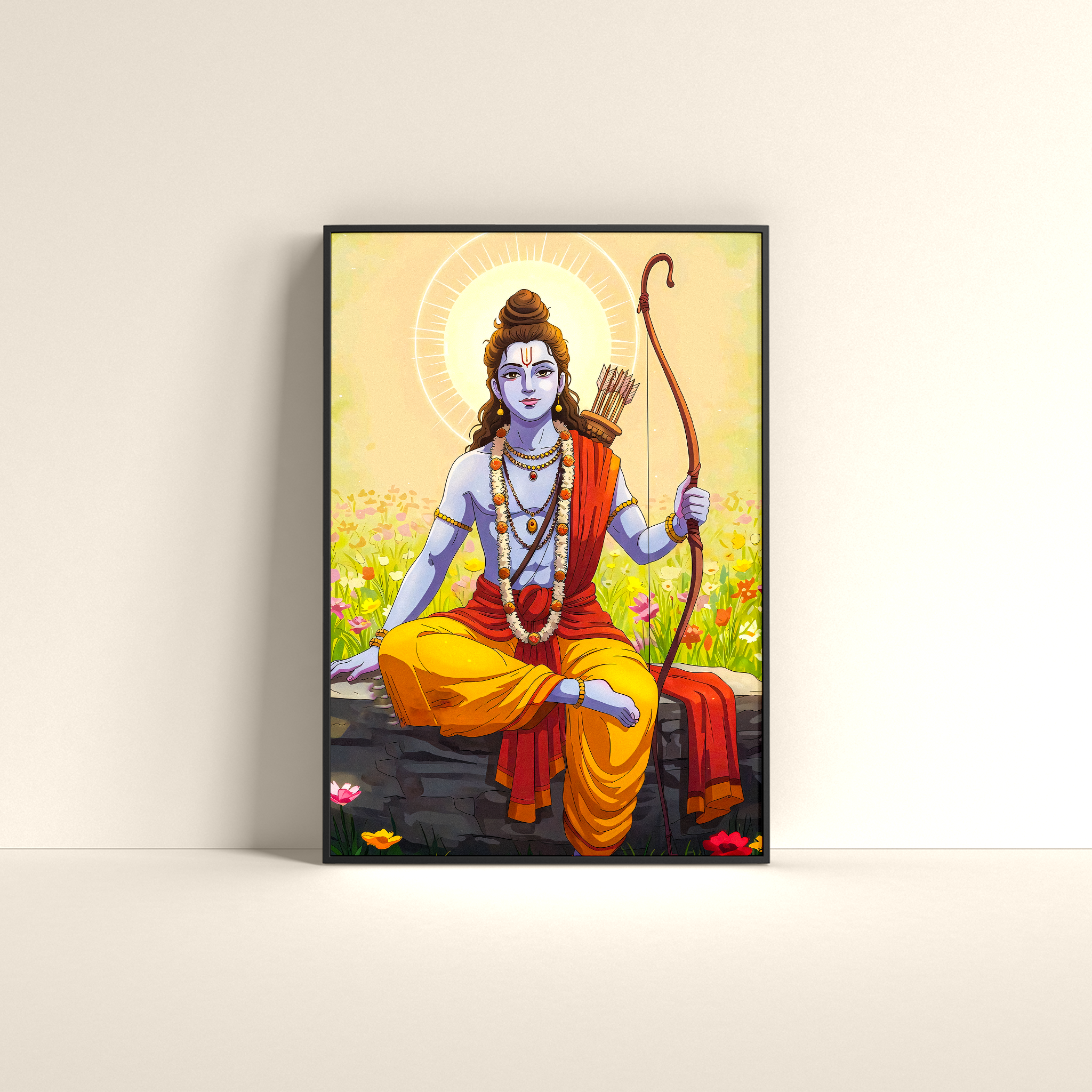 Invite serenity and strength into your space with this vibrant poster of Lord Ram, the revered warrior prince of Ayodhya. Seated gracefully with his iconic bow and arrows, Lord Ram exudes calm authority and divine energy. Set against a colorful floral backdrop with a radiant halo, this artwork blends traditional symbolism with modern aesthetic charm.