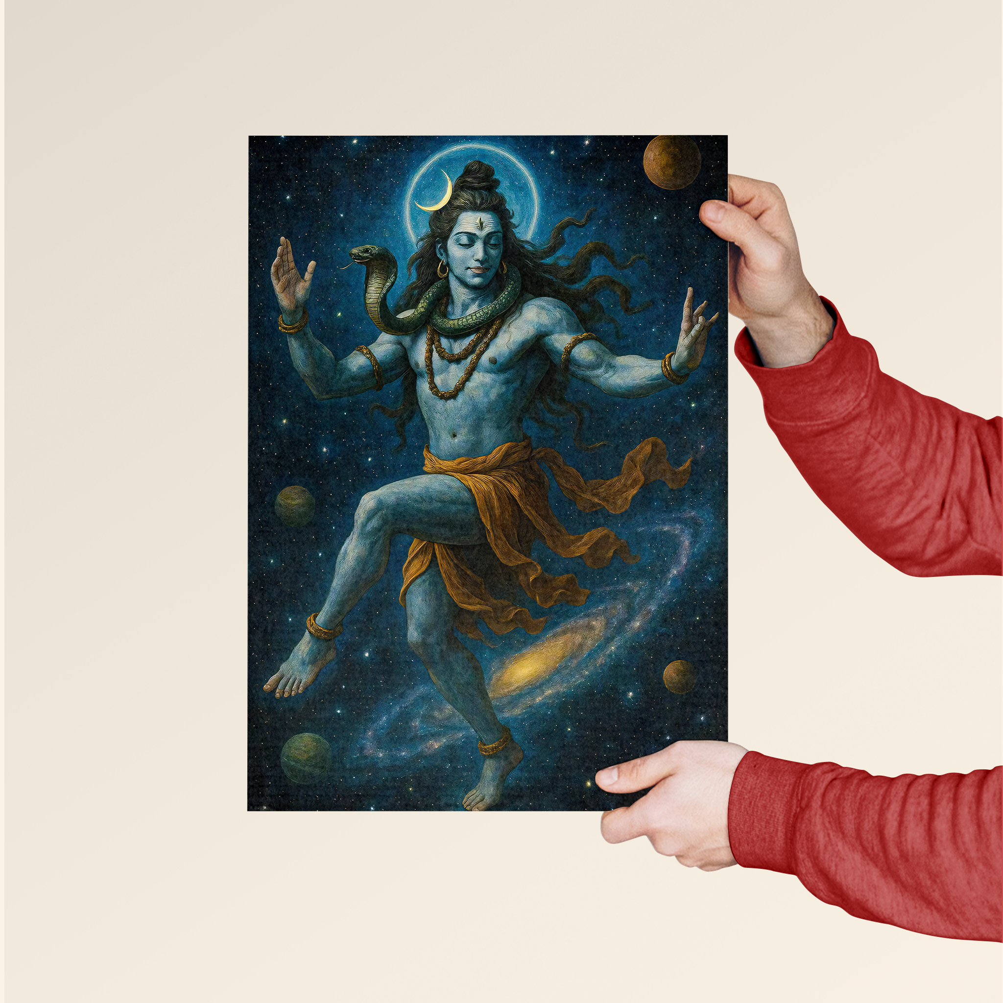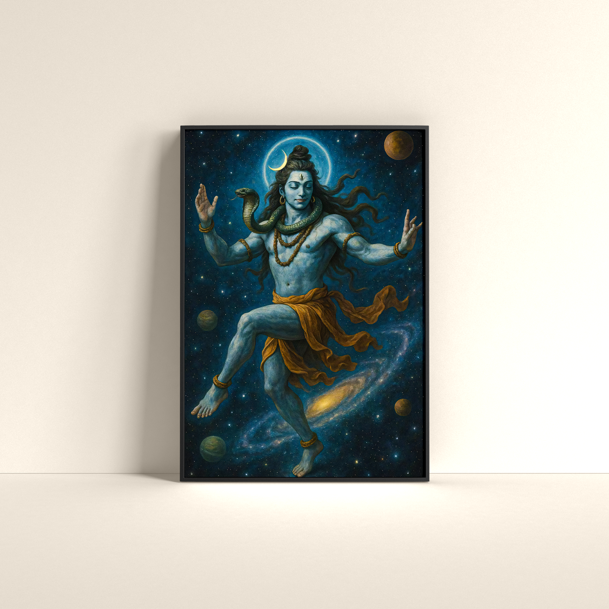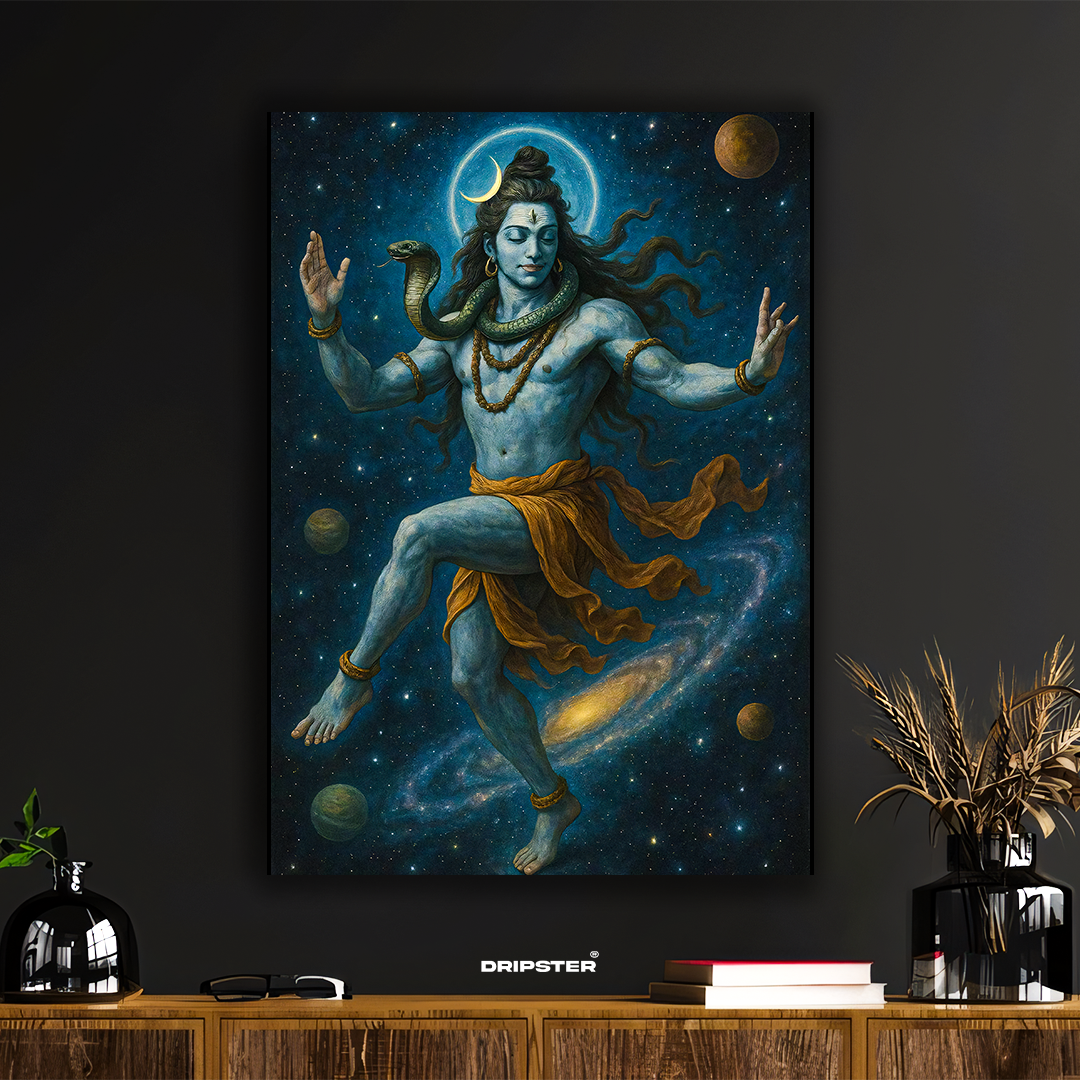Bring divine energy and cosmic balance into your space with this powerful artwork of Lord Shiva performing the Tandava—the celestial dance of creation and destruction. Surrounded by stars, planets, and the vast galaxy, this piece blends spirituality with cosmic beauty in a mesmerizing visual.