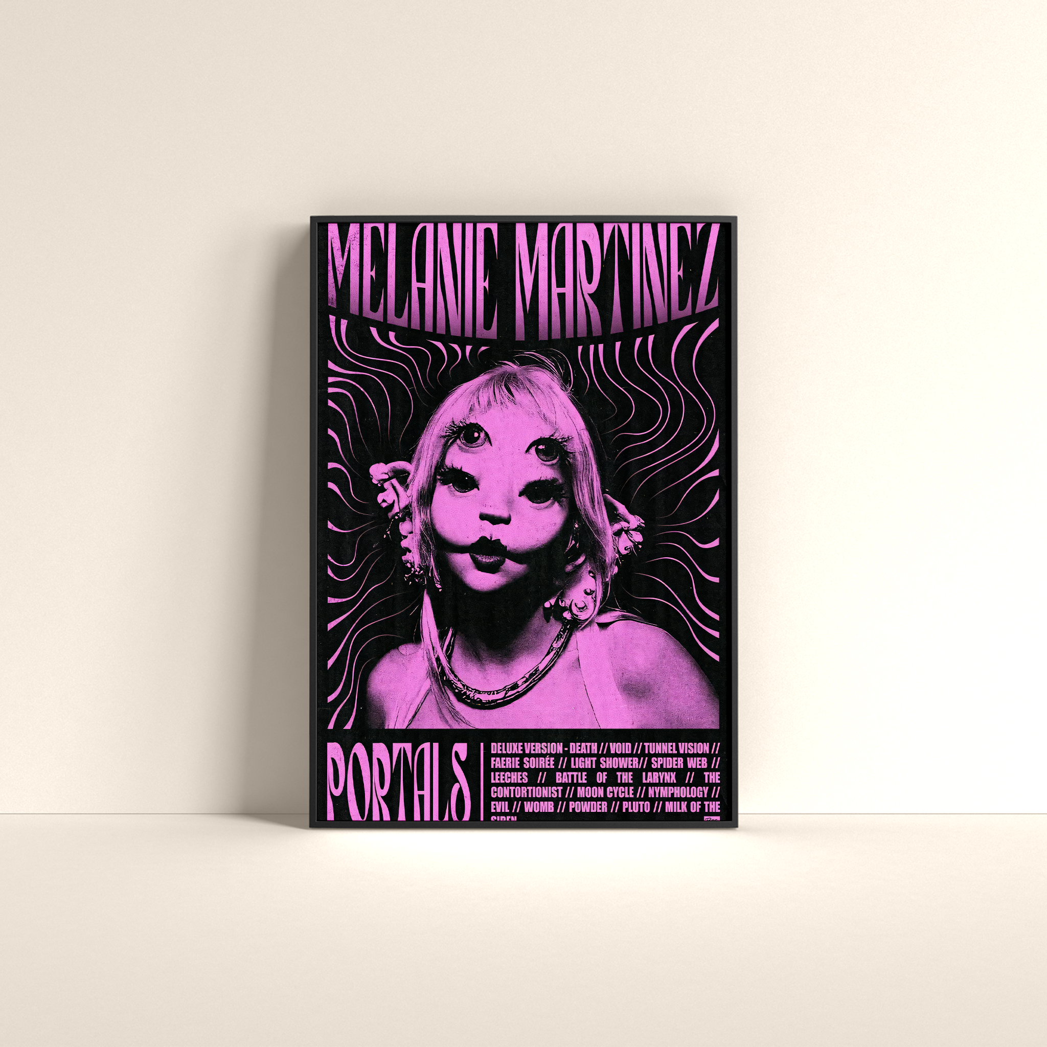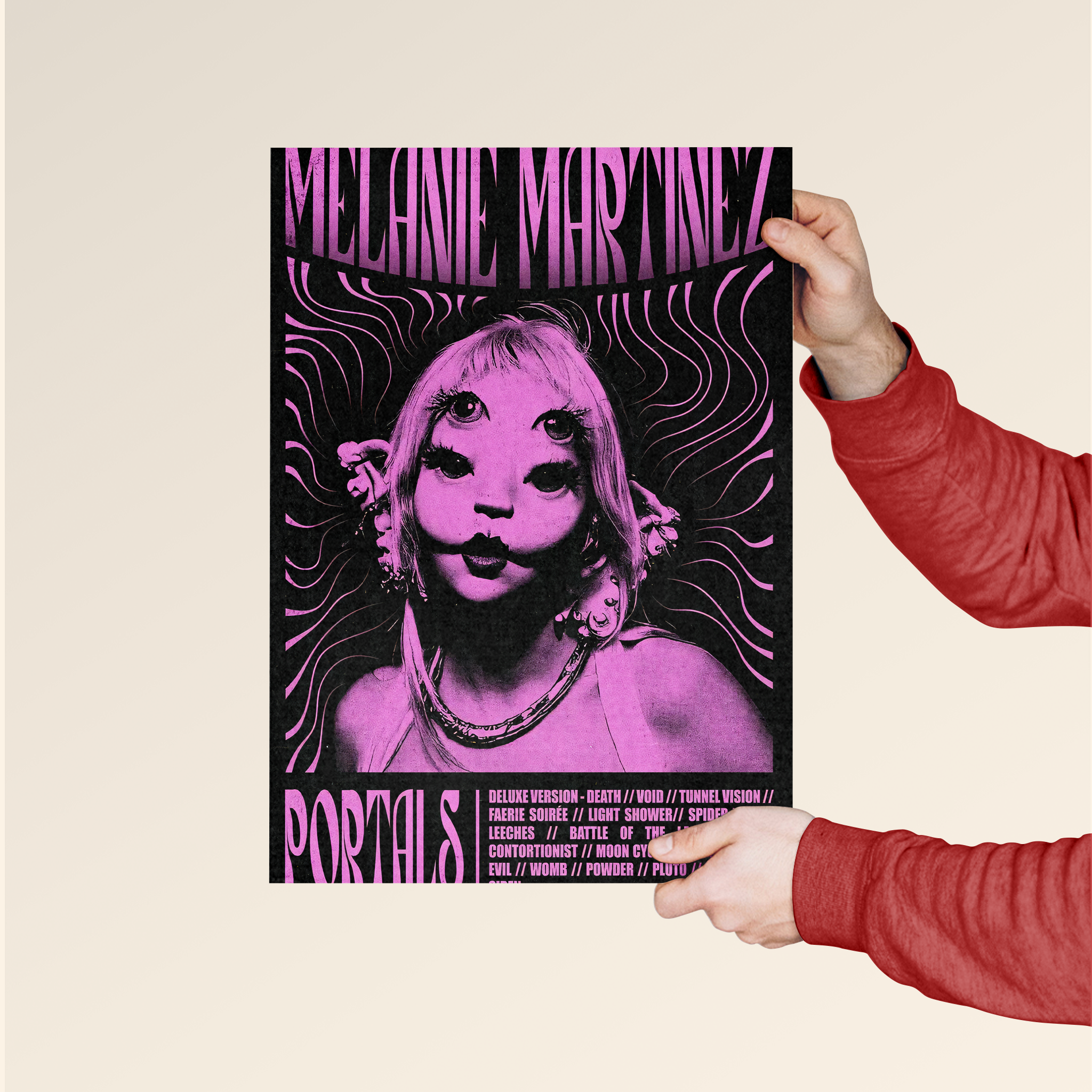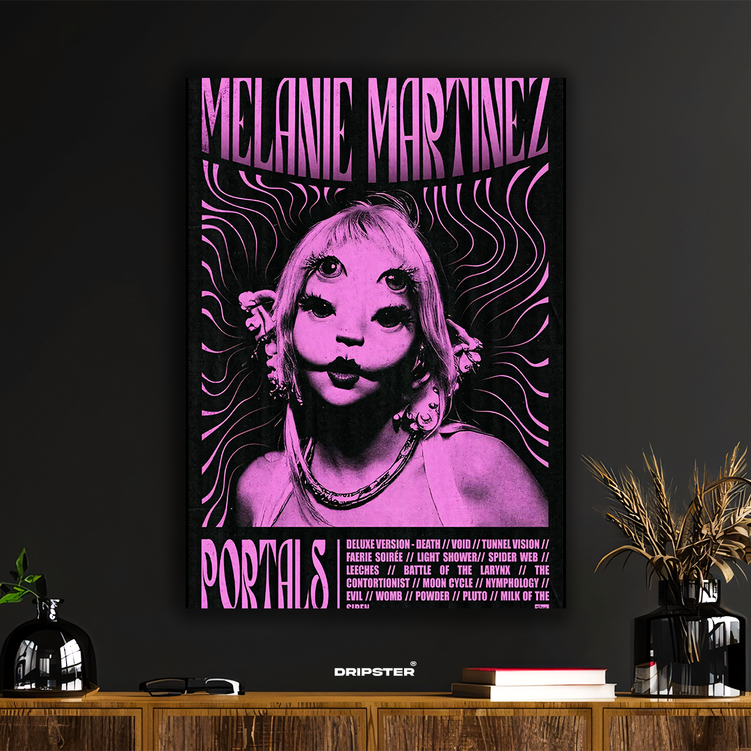 Step into a surreal sonic dimension with this electrifying “Portals” deluxe edition poster featuring Melanie Martinez in her otherworldly form. With trippy, eye-catching visuals bathed in deep purples and eerie neon pinks, this piece captures the haunting beauty and experimental spirit of the Portals era.