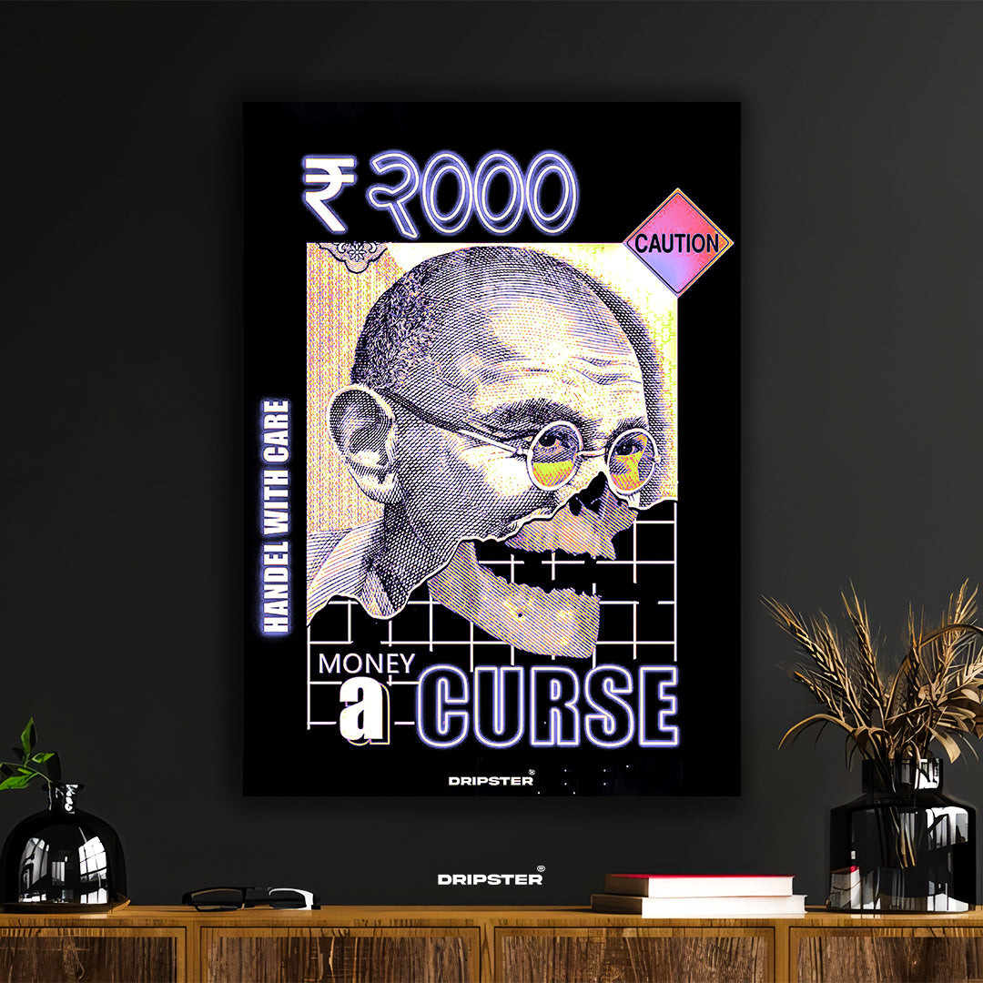 Dive into the thought-provoking world of 'Money a Curse' with this striking art print. Featuring a surreal depiction of Mahatma Gandhi's face merging with a skull, set against a background inspired by the Indian ₹2000 note, this piece challenges conventional perspectives on wealth and value. The design incorporates bold text, neon-like elements, and a 'CAUTION' sign, creating a powerful visual statement.
