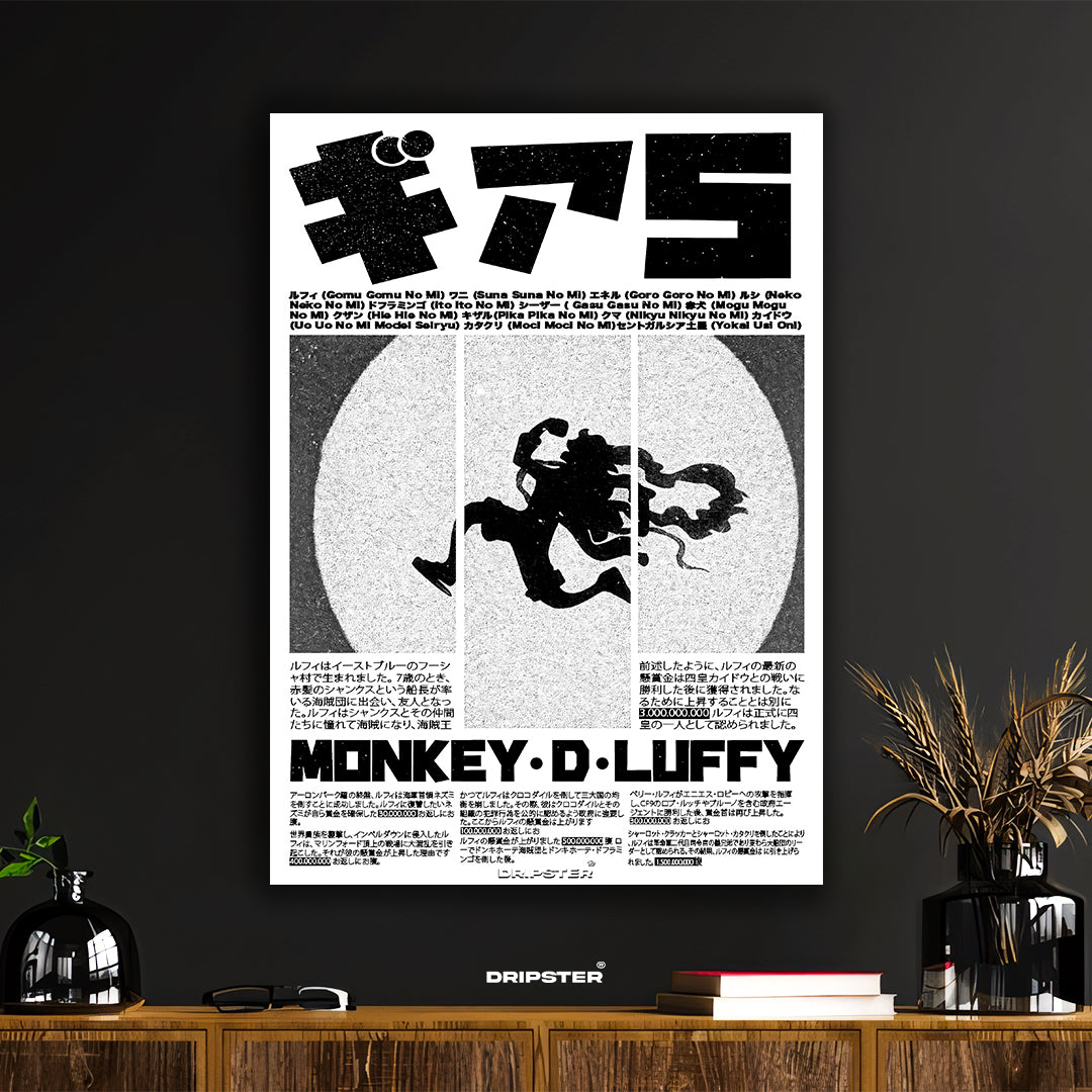 Immerse yourself in the epic world of One Piece with this striking poster featuring Monkey D. Luffy. Captured in a dynamic, distressed silhouette, this artwork embodies the raw power and iconic style of his formidable Gear 5 transformation, making it a powerful visual statement.