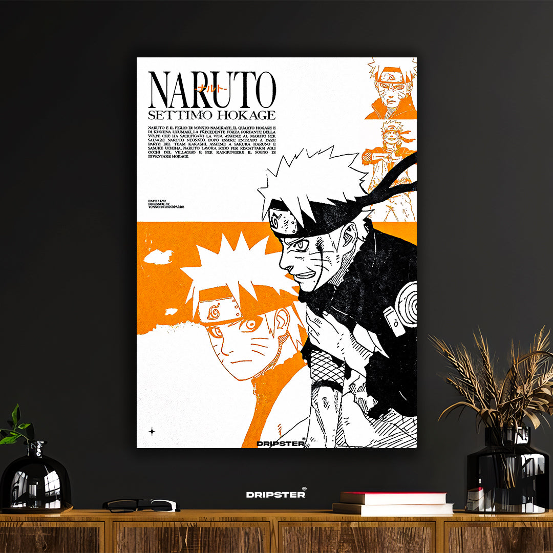 Immerse yourself in the world of shinobi with this striking Naruto Shippuden 'Settimo Hokage' art print. Featuring bold, stylized depictions of Naruto Uzumaki in his journey to become the Seventh Hokage, this vibrant poster captures his determination and iconic look. The dynamic orange and black palette against a clean background makes it a standout piece for any fan's collection.