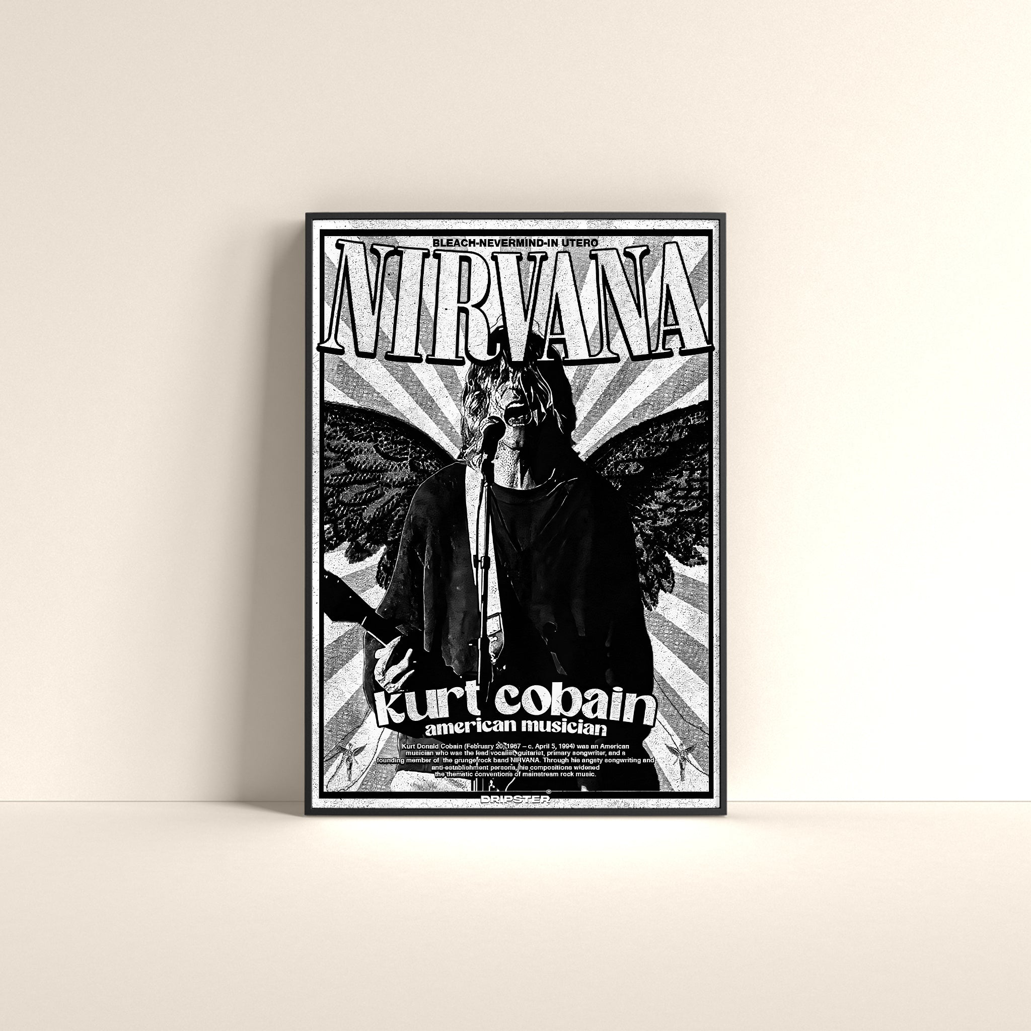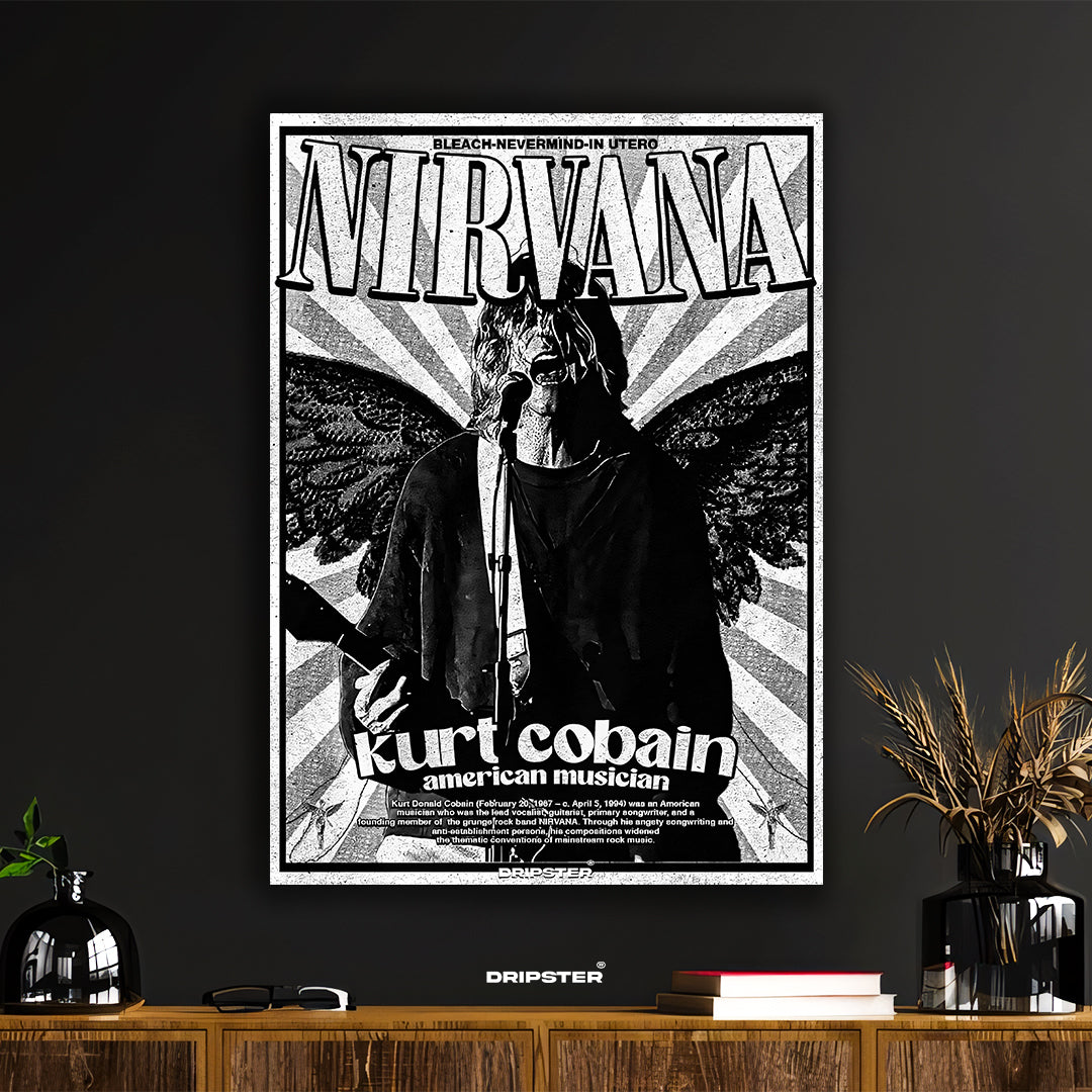 Immerse yourself in the raw energy of the grunge era with this captivating Kurt Cobain tribute poster. Featuring a powerful black and white graphic of the legendary Nirvana frontman with angelic wings, this poster captures the essence of his iconic stage presence. The distressed textures and bold typography evoke the authentic vintage aesthetic of classic concert art, making it a striking piece for any space.