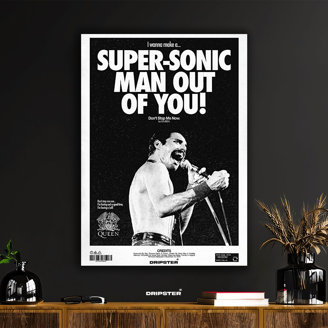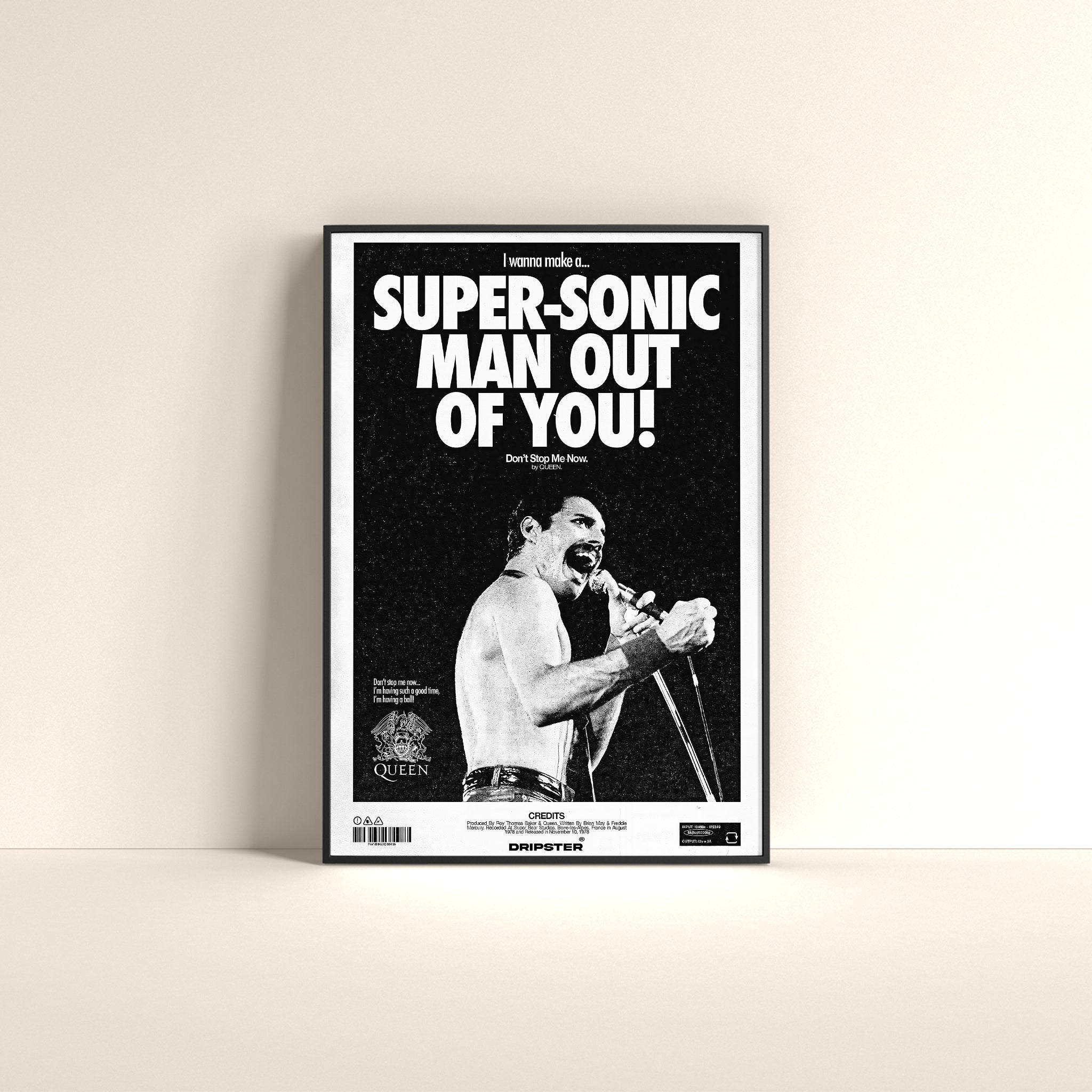 Capture the electrifying energy of Freddie Mercury with this iconic "Super-Sonic Man" poster, directly inspired by Queen's legendary hit "Don't Stop Me Now." This striking black and white print features a classic concert shot of Freddie in full vocal power, perfectly encapsulating the raw charisma and unparalleled stage presence of a true rock icon. It's a powerful piece designed to bring the vibrant spirit of live music directly into your space.