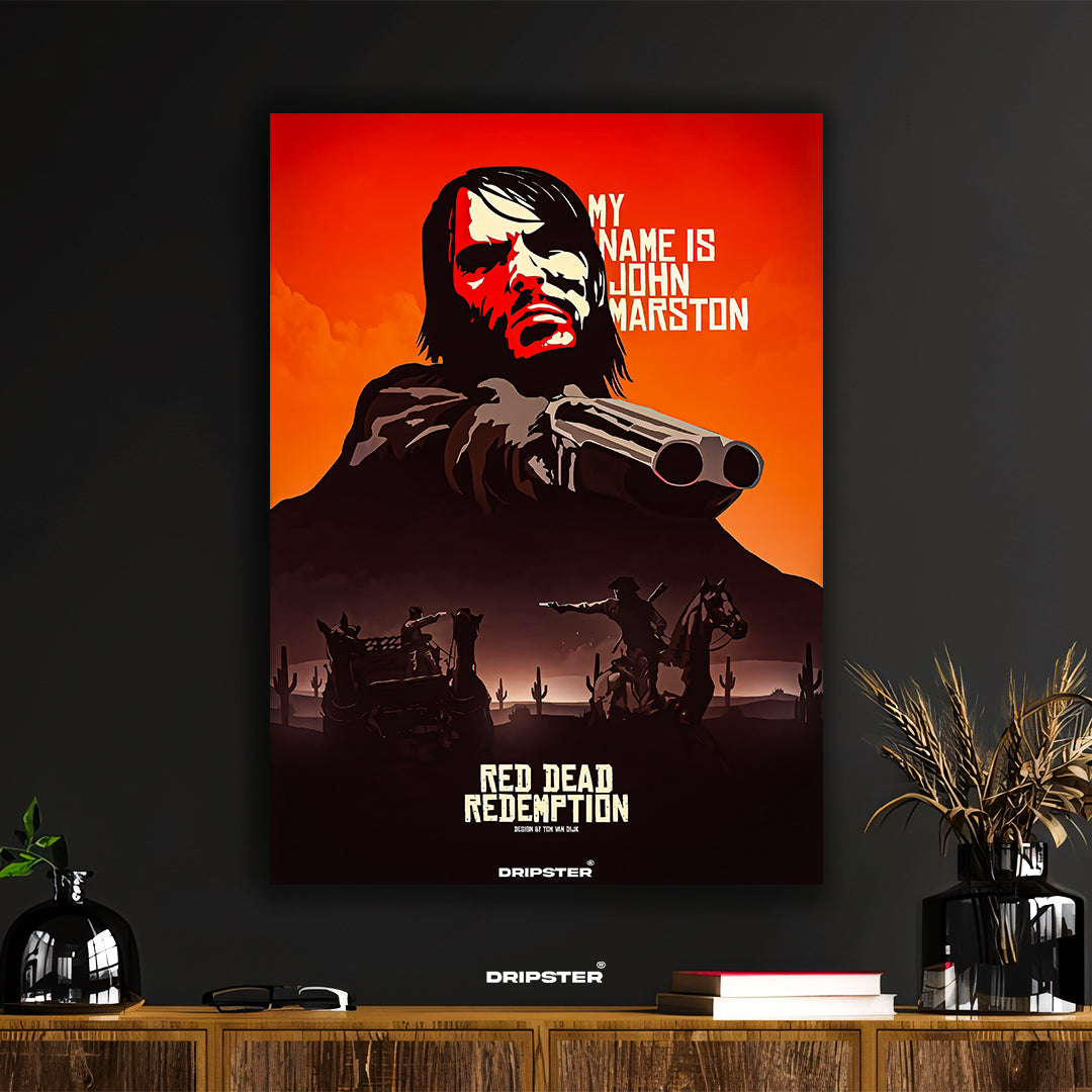Immerse yourself in the gritty world of the Wild West with this captivating 'Red Dead Redemption' poster featuring the iconic declaration, 'My Name Is John Marston'. This high-quality print showcases a striking, stylized illustration of John Marston, gun in hand, set against a dramatic red and orange sky, with the silhouetted landscape of the frontier below, bringing the spirit of the beloved game to your space.