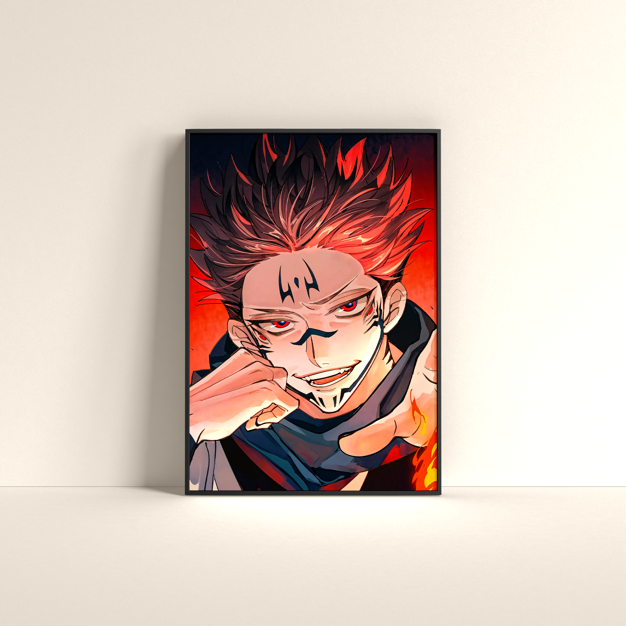 Unleash chaos and power with this intense poster of Ryomen Sukuna from Jujutsu Kaisen. Capturing the King of Curses in a fierce close-up, his signature markings, crimson eyes, and sinister smirk radiate dominance and danger. The fiery red background enhances the energy and menace of the infamous sorcerer-turned-curse, making it a must-have for anime fans who love bold, dramatic visuals.