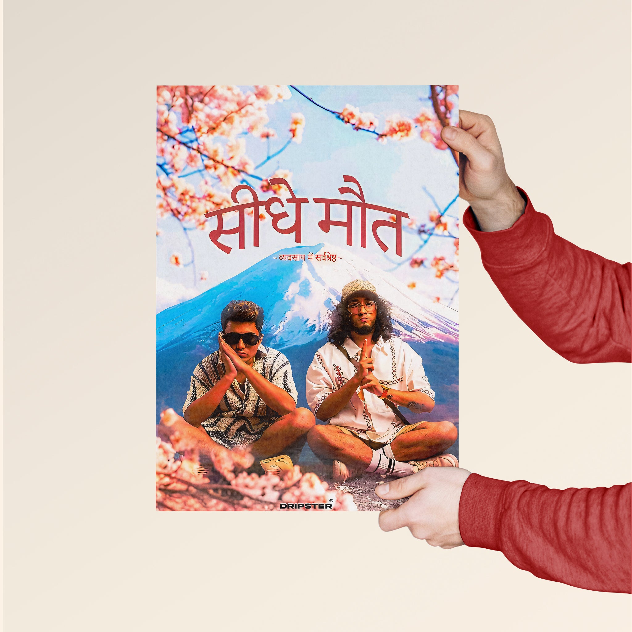 Embrace the serene yet powerful energy of this poster featuring the hip-hop duo Seedhe Maut, set against a stunning backdrop of a snow-capped mountain and delicate cherry blossoms. The artists are depicted in a contemplative, seated pose, suggesting a moment of peace or reflection. The prominent Hindi text "सीधे मौत" (Seedhe Maut) in red, along with the phrase "यत्साव में सर्वश्रेष्ठ" (Yatsaav Mein Sarvashreshtha, meaning "Best in practice" or "Best in their essence"), adds a layer of depth and personal motto to this artistic piece. The blend of natural beauty and urban artistry creates a unique and harmonious visual.