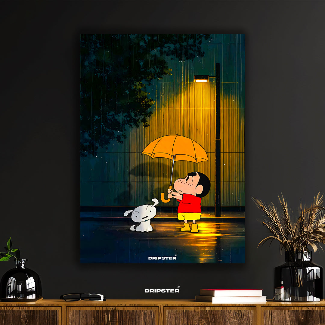 Capture the heartwarming moment of friendship with this enchanting poster featuring Shin-chan and his loyal dog Shiro sharing an umbrella on a rainy night. The vibrant orange umbrella pops against the moody, atmospheric background of a city street under a warm lamplight, evoking a sense of cozy nostalgia and companionship amidst the gentle downpour.