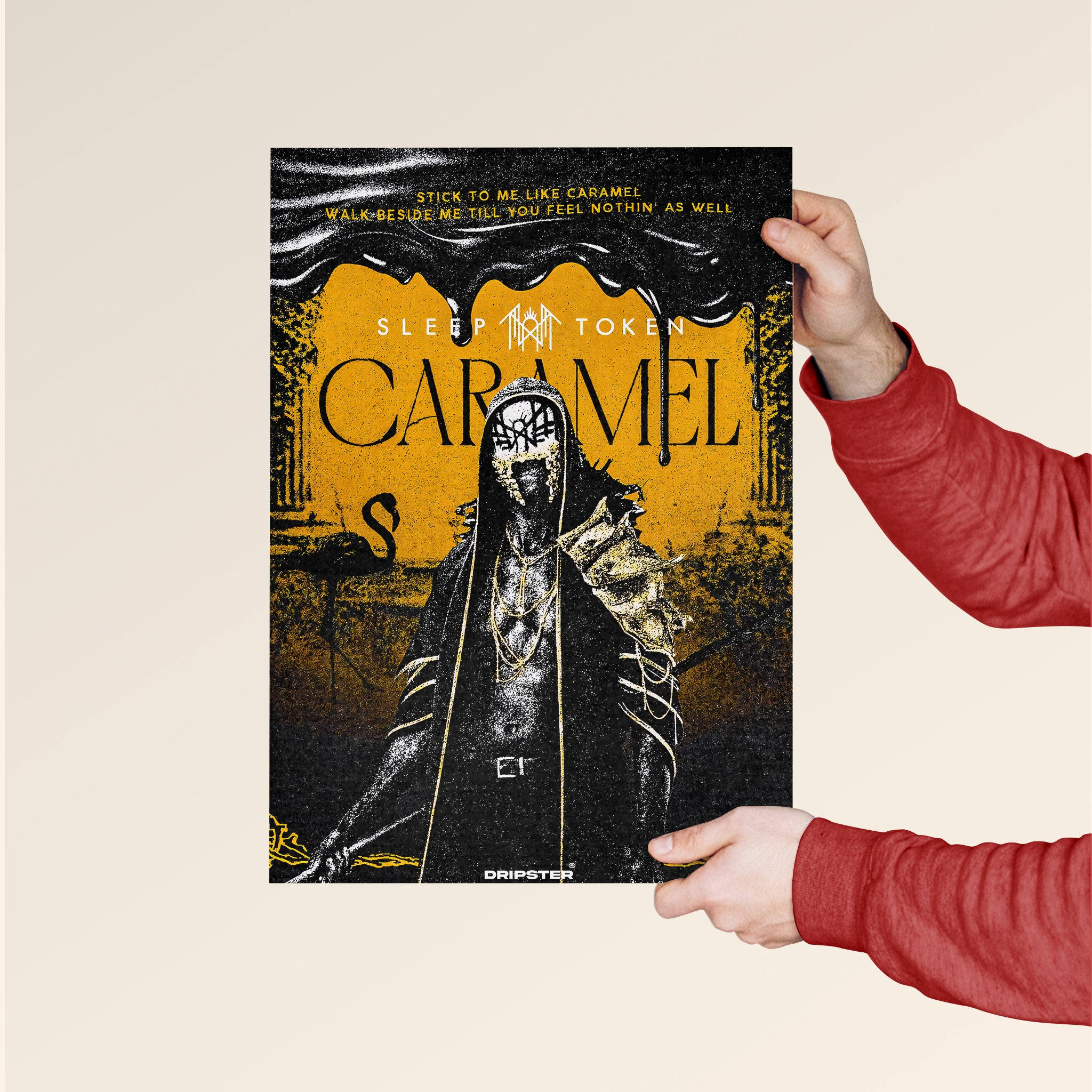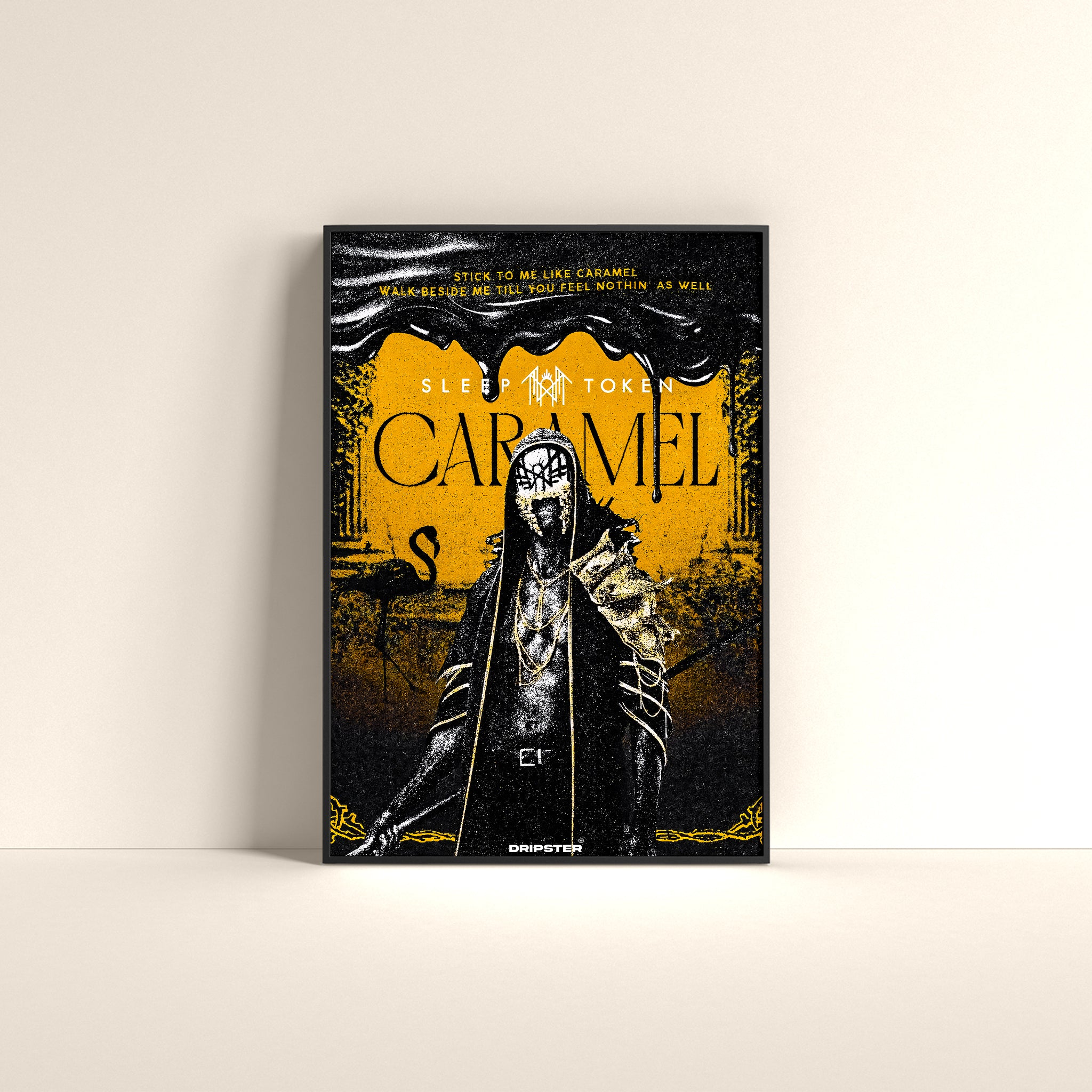 Immerse yourself in the haunting world of Sleep Token with this captivating poster featuring the lyrics "Stick To Me Like Caramel, Walk Beside Me Till You Feel Nothin' As Well". The design showcases intricate, dark artwork centered around the masked figure synonymous with the band, set against a textured, golden backdrop reminiscent of flowing caramel. This piece captures the intense and atmospheric essence of the song and the band's unique visual identity.