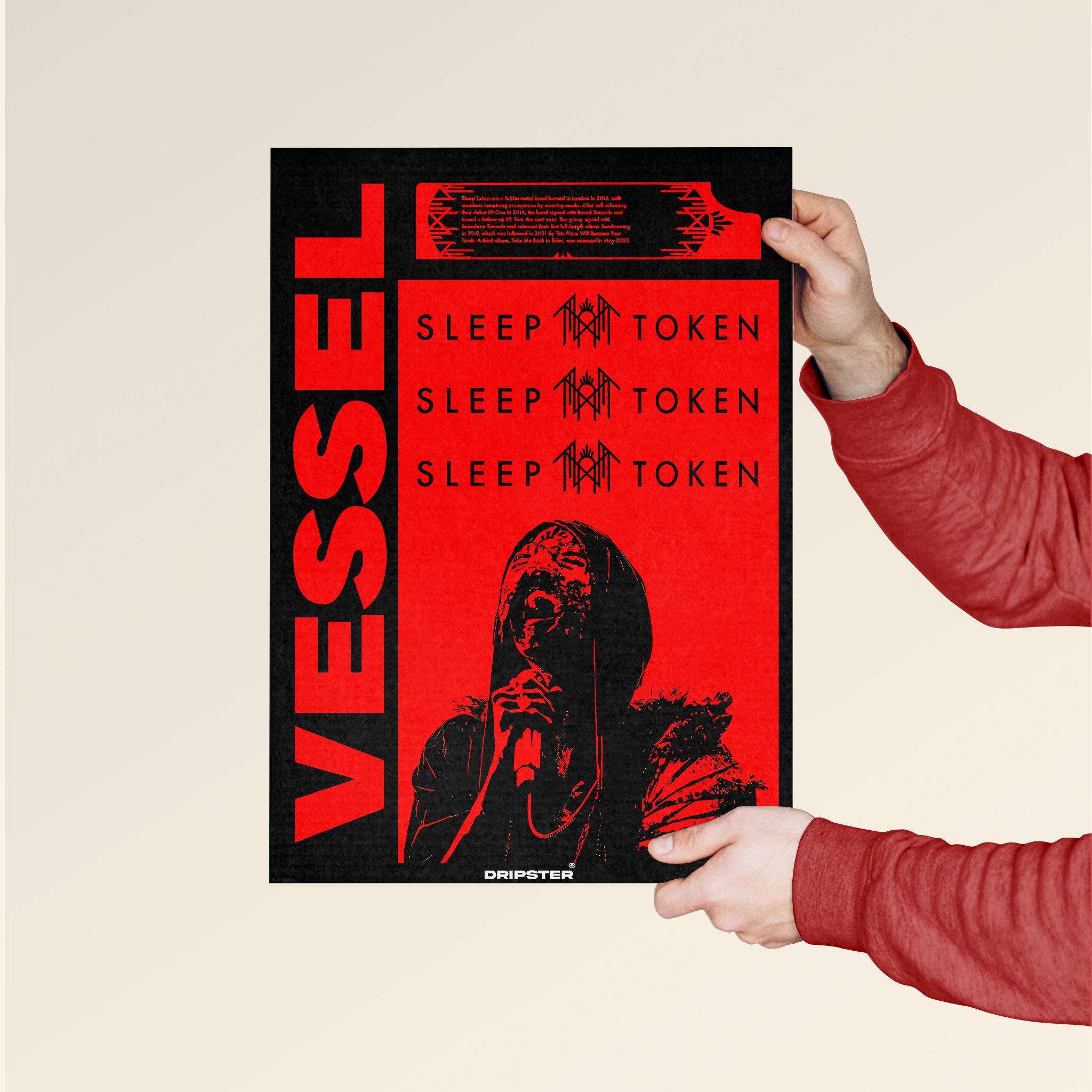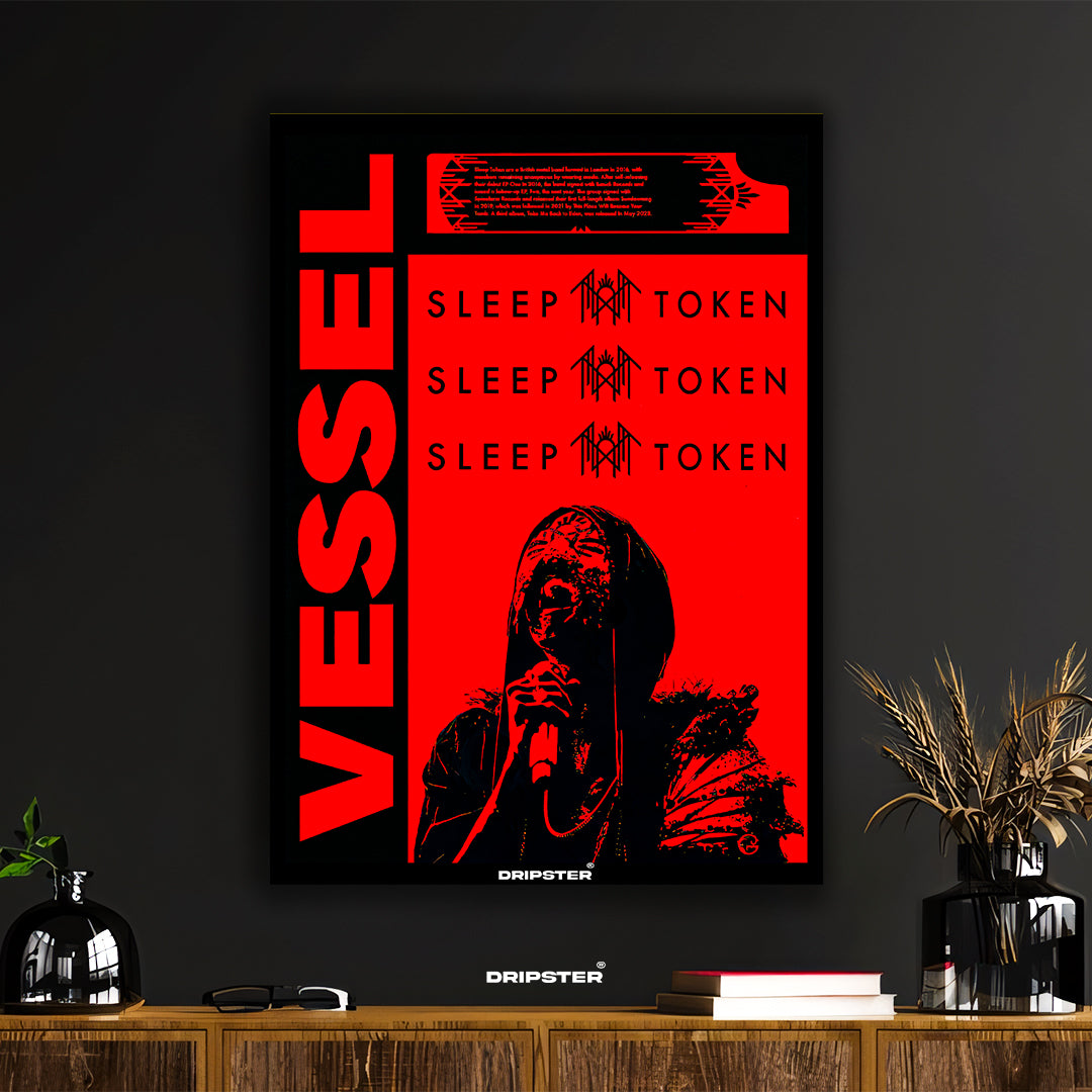 Immerse yourself in the enigmatic world of Sleep Token with this striking poster. Featuring the prominent 'VESSEL' text alongside the band's iconic name and symbol against a bold red and black backdrop, this design captures the intense energy of the mysterious collective. A must-have piece for any true worshipper, bringing the band's powerful aesthetic to your space.