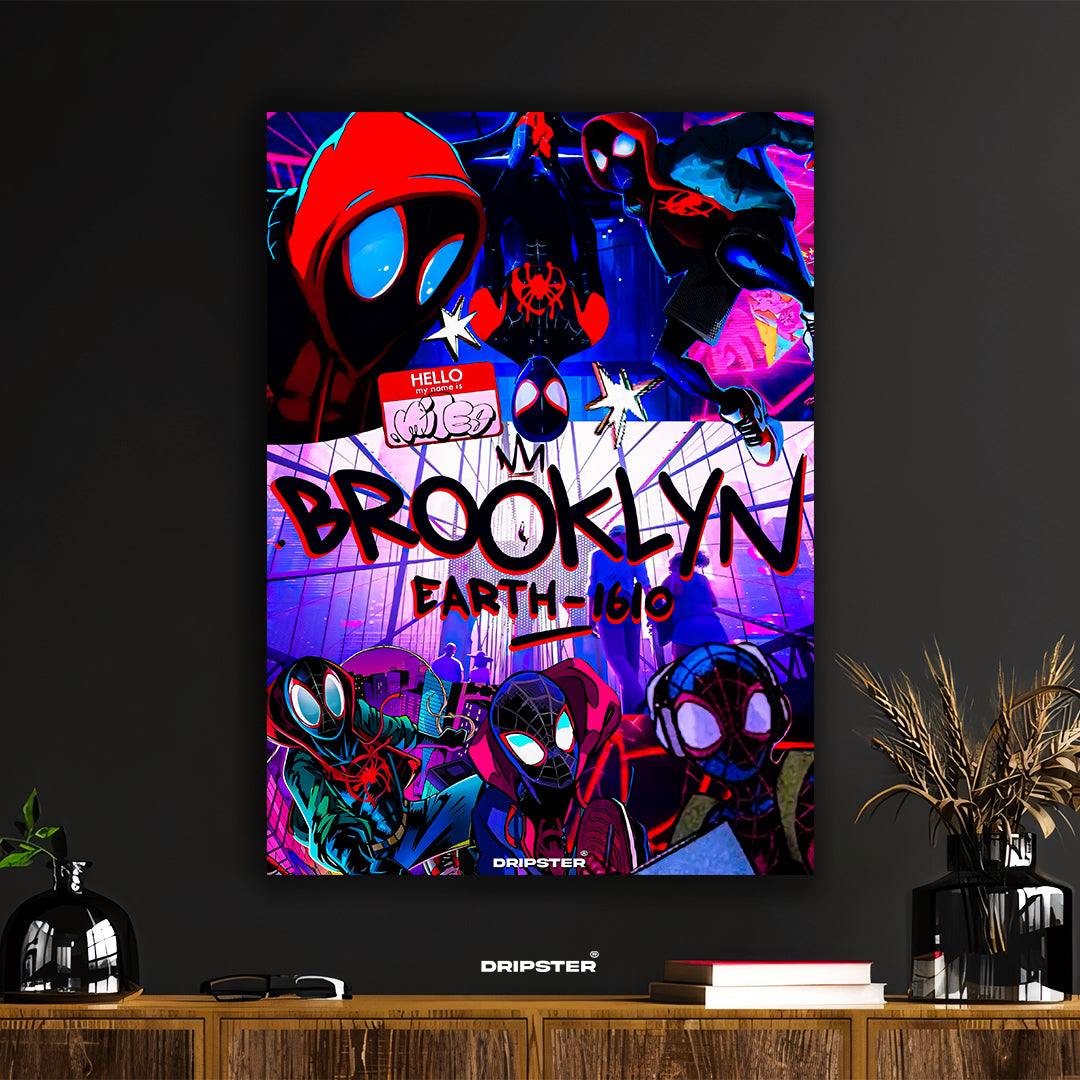 Immerse yourself in the multi-dimensional world of Spider-Verse with this vibrant art poster, featuring iconic characters from Brooklyn, Earth-1610. This dynamic design captures the essence of urban superheroism with its striking neon colors, graffiti-style elements, and a blend of familiar and alternate Spider-People, creating a visually electrifying piece that pops off the wall.