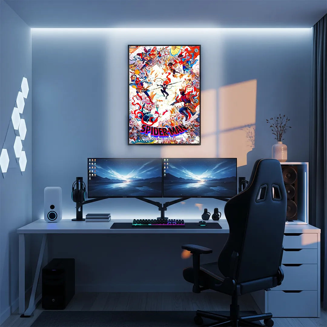 Step into the chaos and color of infinite dimensions with this explosive Flash Frame from Spider-Man: Across the Spider-Verse. Featuring a swirl of Spider-heroes in dynamic motion, this LED-lit piece is a visual tribute to identity, power, and the web that connects us all.