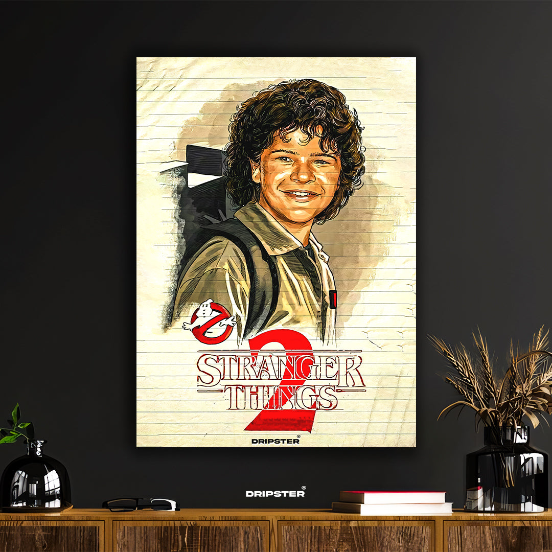 Capture the nostalgic charm of Stranger Things Season 2 with this unique art print featuring Dustin Henderson geared up in his iconic Ghostbusters costume. This vibrant illustration brings one of the series' most memorable moments to life, blending the beloved characters and themes in a detailed, eye-catching style.