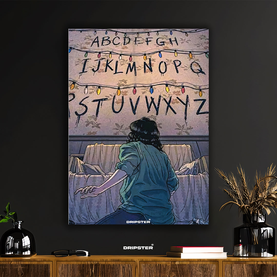 Relive the iconic, chilling moment from Stranger Things with this stunning poster featuring Eleven and the infamous alphabet wall. Illuminated by the eerie glow of Christmas lights, this artwork captures the tension and mystery of the Upside Down communicating with the real world. A must-have piece for any fan of the hit series, bringing a touch of Hawkins' paranormal activity to your space.