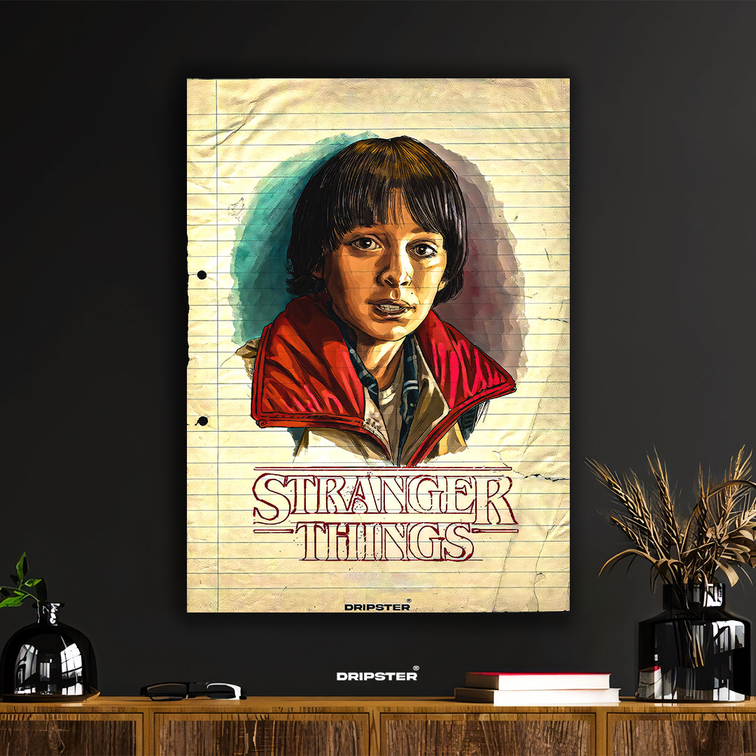 Capture the nostalgic and mysterious vibe of Hawkins with this unique poster featuring an artistic illustration of Will Byers. Rendered in a vibrant, expressive style against a backdrop resembling lined notebook paper, this artwork evokes the classic era and the compelling character at the heart of the early seasons.