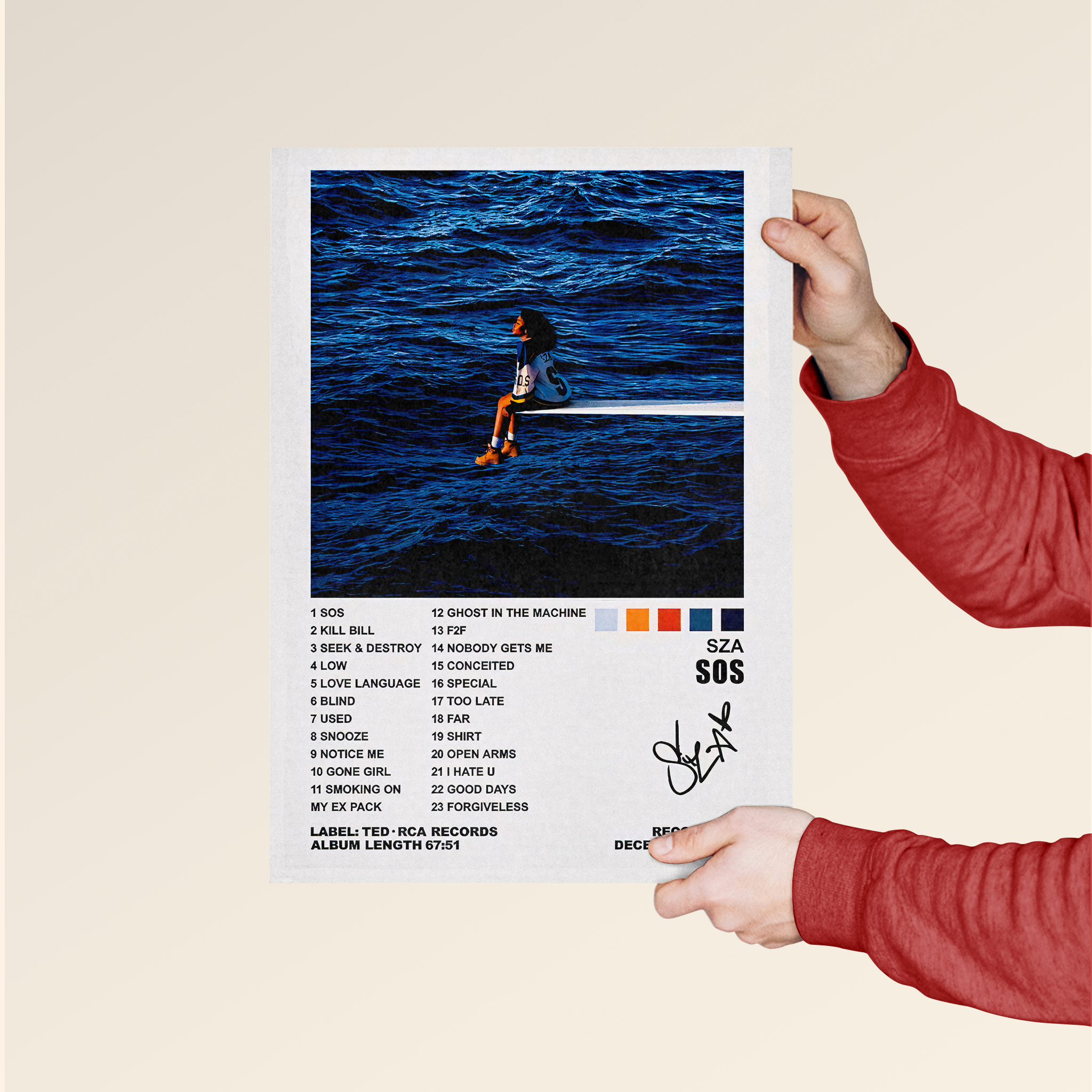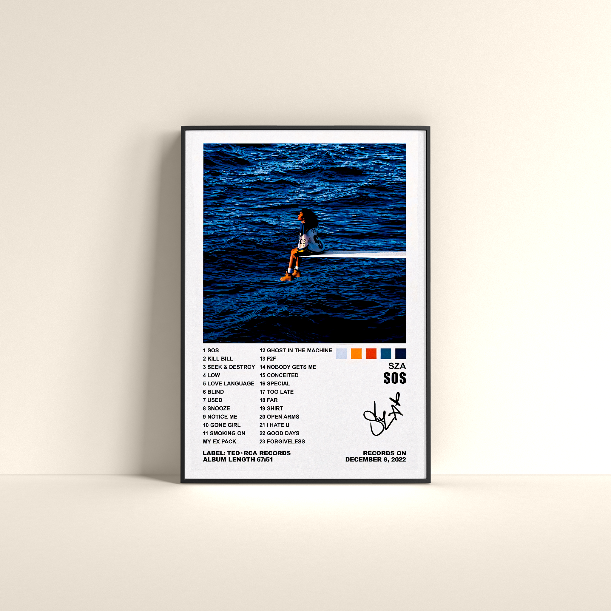 Celebrate the soulful brilliance of SZA’s SOS with this stunning tracklist poster, featuring the iconic deep blue ocean backdrop and her solitary figure perched above the waves. Designed with elegant track listing and minimalist color swatches, this poster encapsulates the emotion, vulnerability, and strength of one of R&B’s most powerful albums.