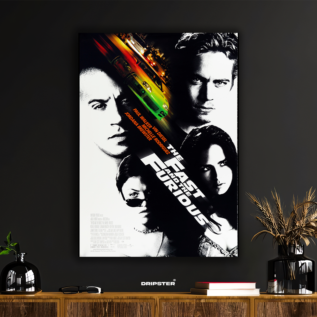 Celebrate the film that launched a global phenomenon with this bold The Fast and the Furious poster. Featuring iconic characters like Dominic Toretto (Vin Diesel) and Brian O’Conner (Paul Walker), this design blends gritty street style with the intensity of underground racing. With its dramatic black-and-white portraits and neon-lit racing action, this poster is perfect for fans of the franchise’s raw beginnings.