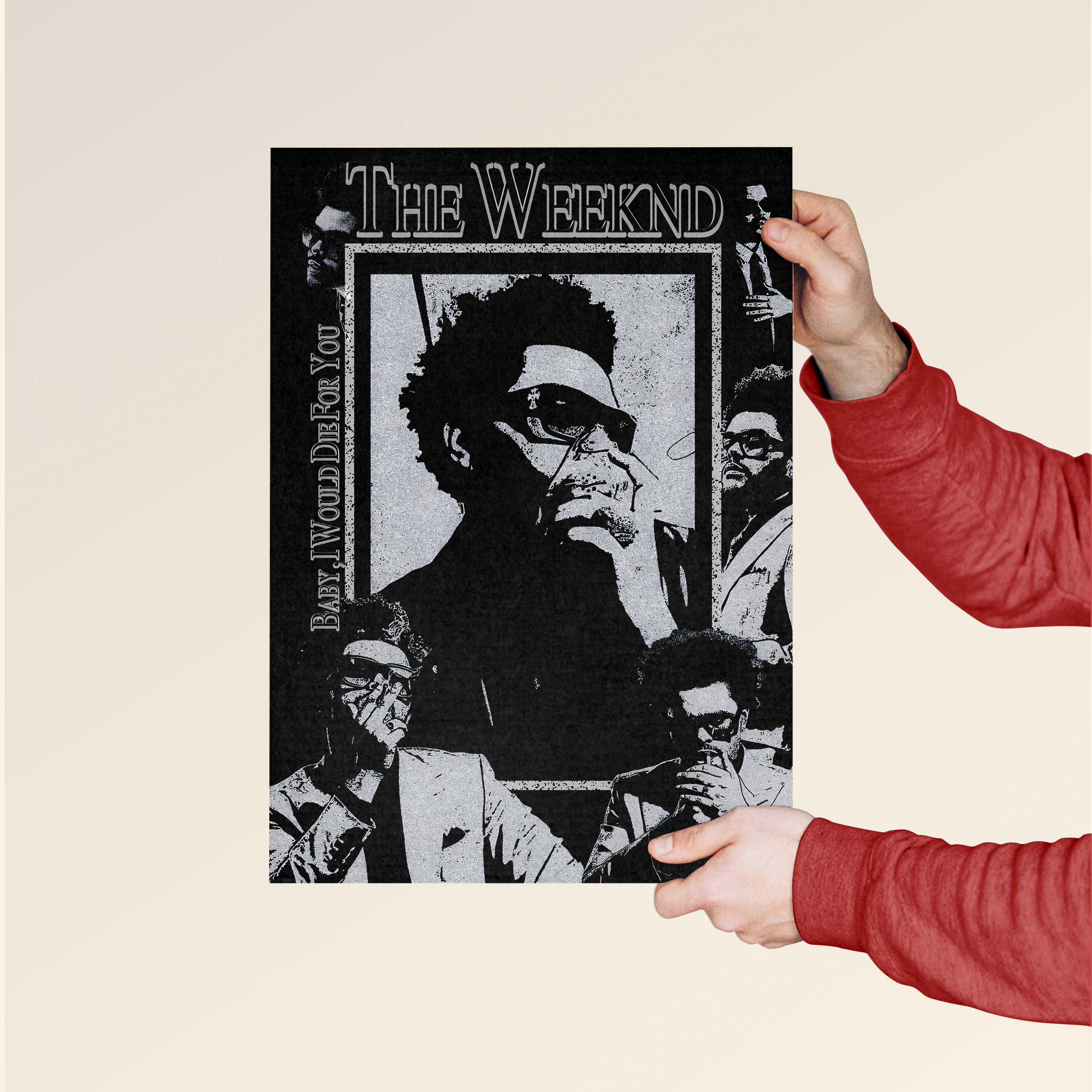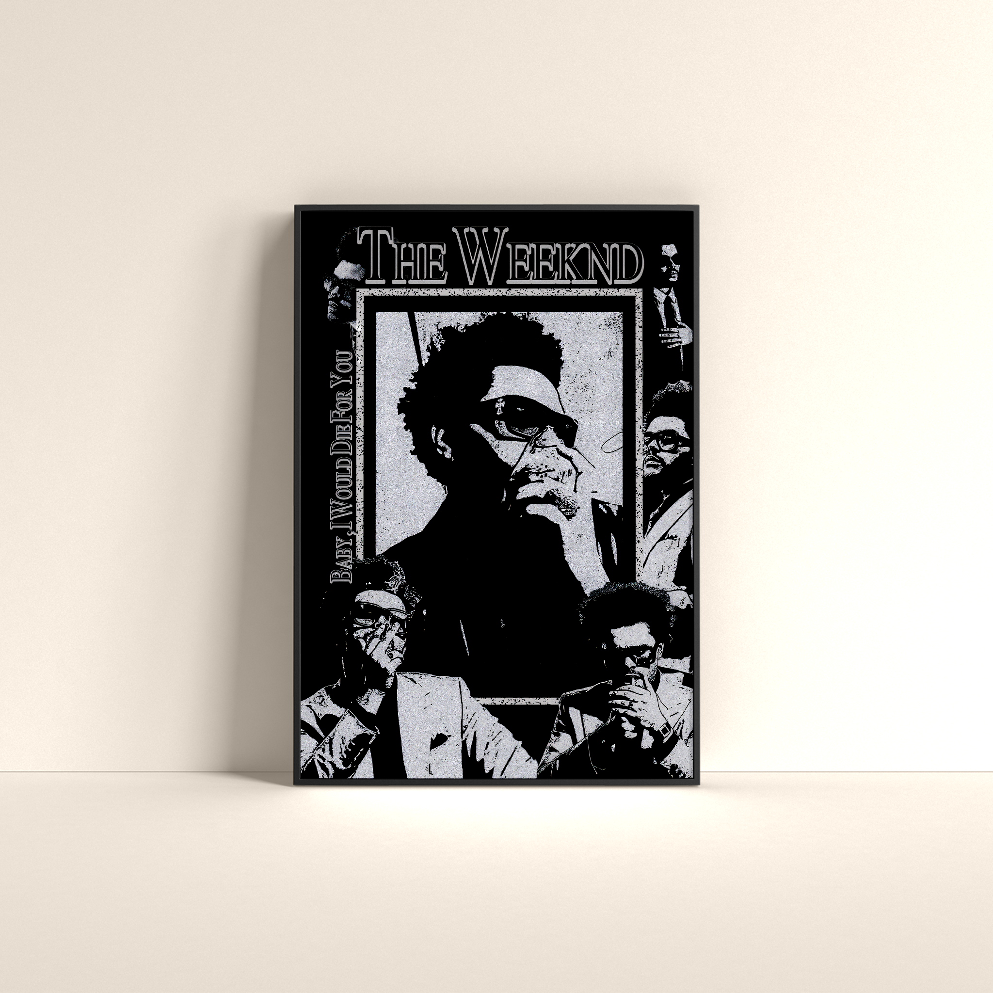 Dive into the moody brilliance of The Weeknd with this noir-style poster inspired by his iconic Baby I Would Die for You era. This monochrome collage captures the mystique and emotional depth of the artist through layered visuals, dark tones, and vintage textures that mirror the intensity of his music.