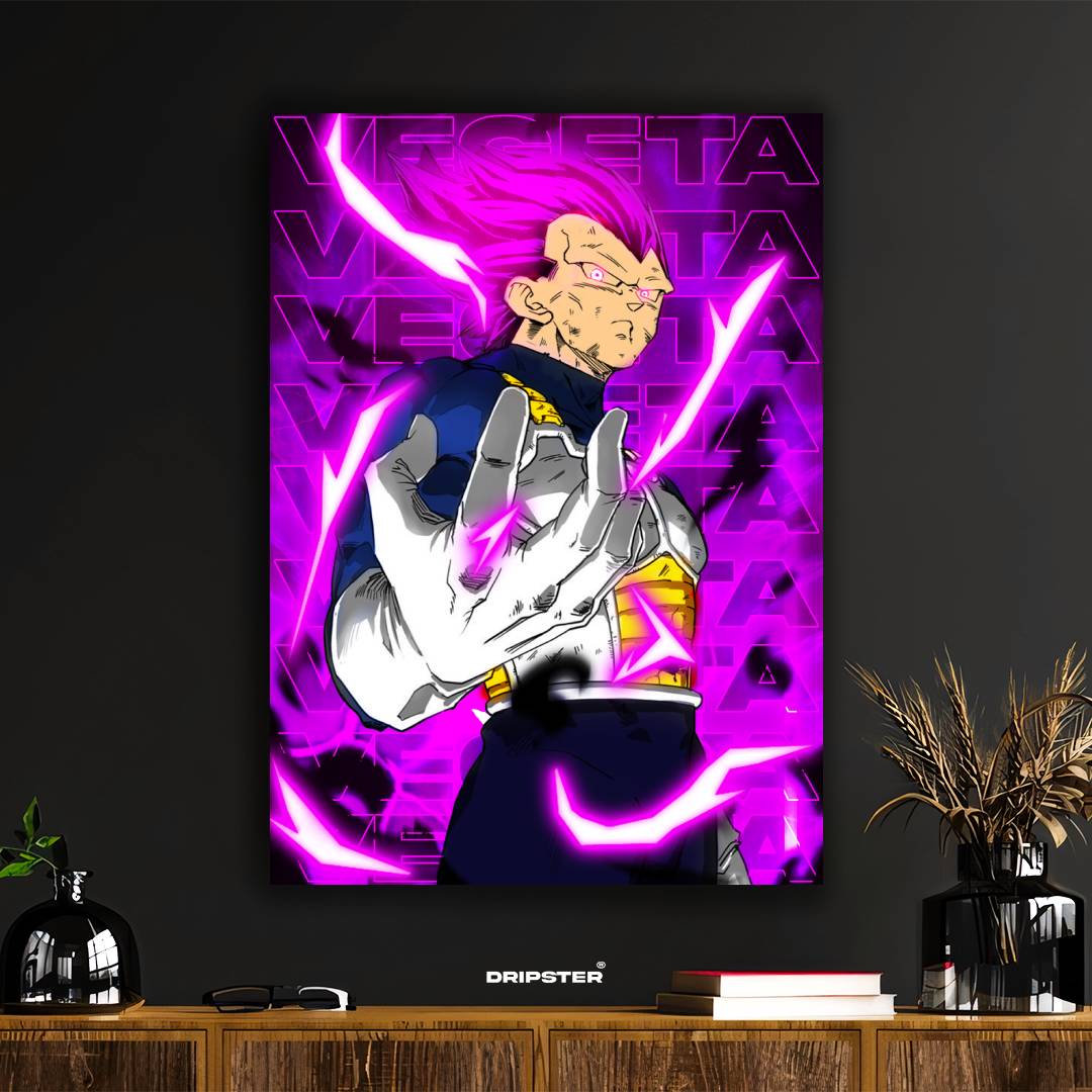 Embrace the unrelenting energy of Prince Vegeta in his Ultra Ego form with this electrifying poster. Bathed in fierce purple tones and surrounded by lightning, Vegeta exudes raw power and pride. His intense gaze and dominating stance make this piece a tribute to the Saiyan warrior’s relentless pursuit of strength.
