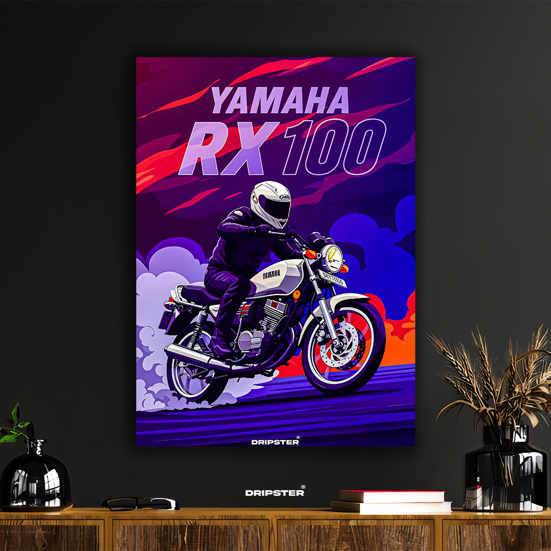 This artwork is a must-have for any motorcycle enthusiast, especially fans of the legendary Yamaha RX 100. It's perfect for adding a touch of retro cool and speed to a garage, man cave, living room, or office, celebrating a true icon of two-wheeled history.