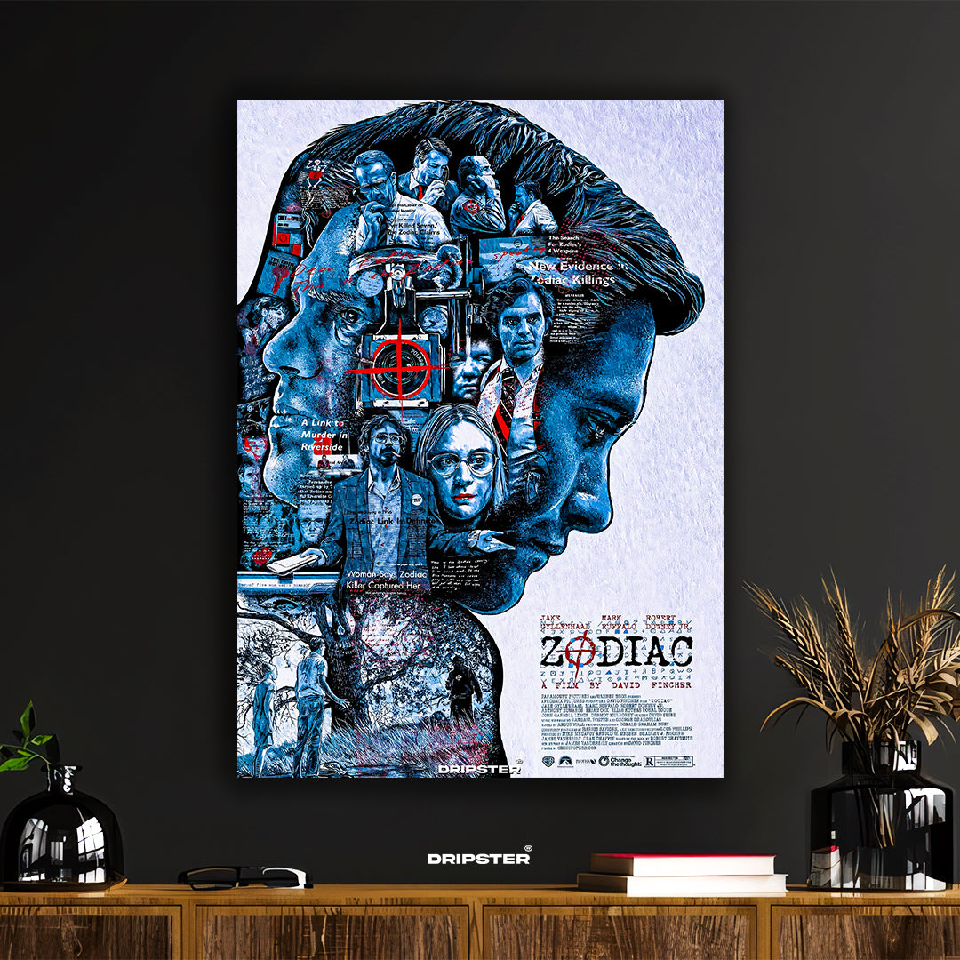 Immerse yourself in the gripping world of David Fincher's 'Zodiac' with this compelling art print. Featuring a layered design that incorporates key characters like Jake Gyllenhaal, Mark Ruffalo, and Robert Downey Jr., alongside haunting imagery and newspaper clippings related to the infamous case, this poster captures the intense investigation and dark mystery surrounding the Zodiac Killer.